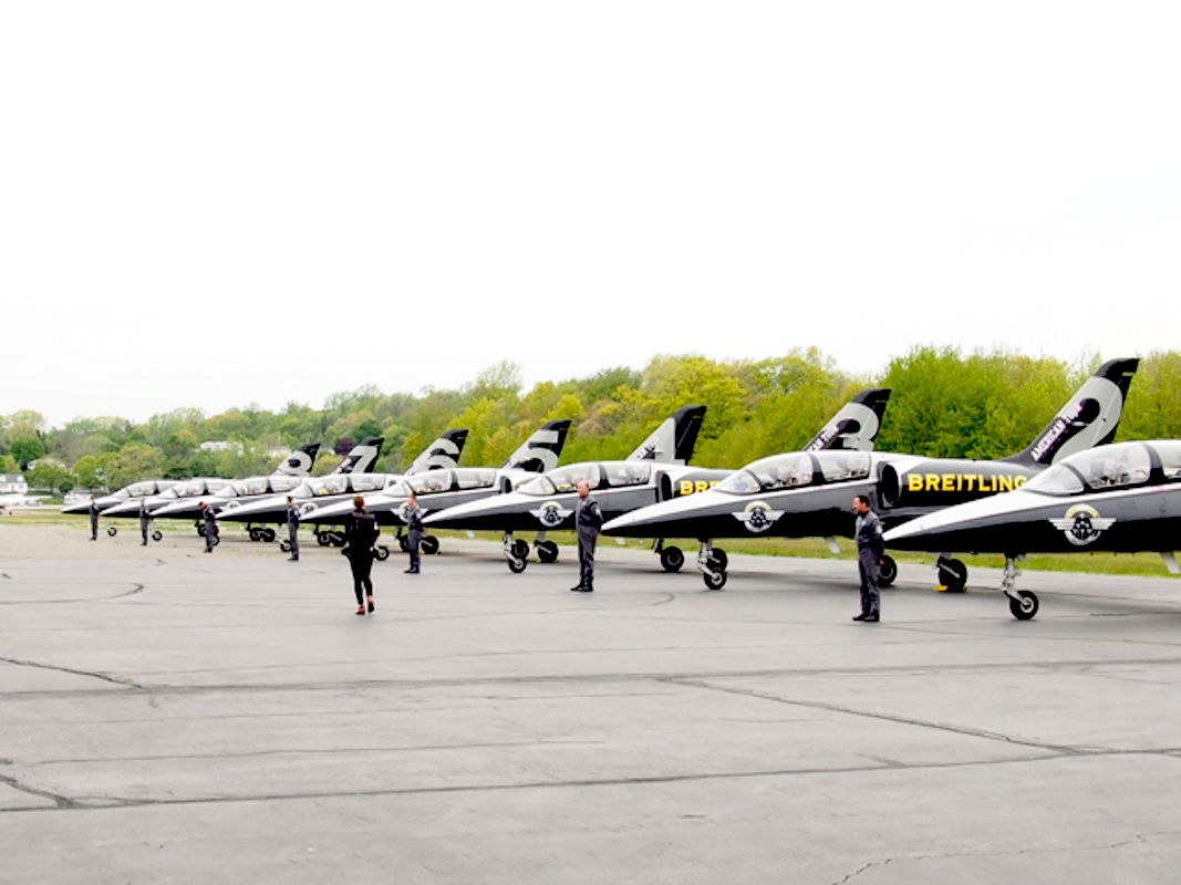 Perhaps what struck me the most when our seaplane touched down in Connecticut at the Tweed New Haven airport, was the fact that in front of us – perfectly lined up in majestic beauty – stood eight L-39 Albatros military training jets –noses pointed down, wearing Breitling blue and yellow colors and with eight pilots and eight mechanics standing formation in front of the jets. It was a like a scene straight out of the movie Top Gun, and I was immediately struck by the fact that these are no ordinary pilots.