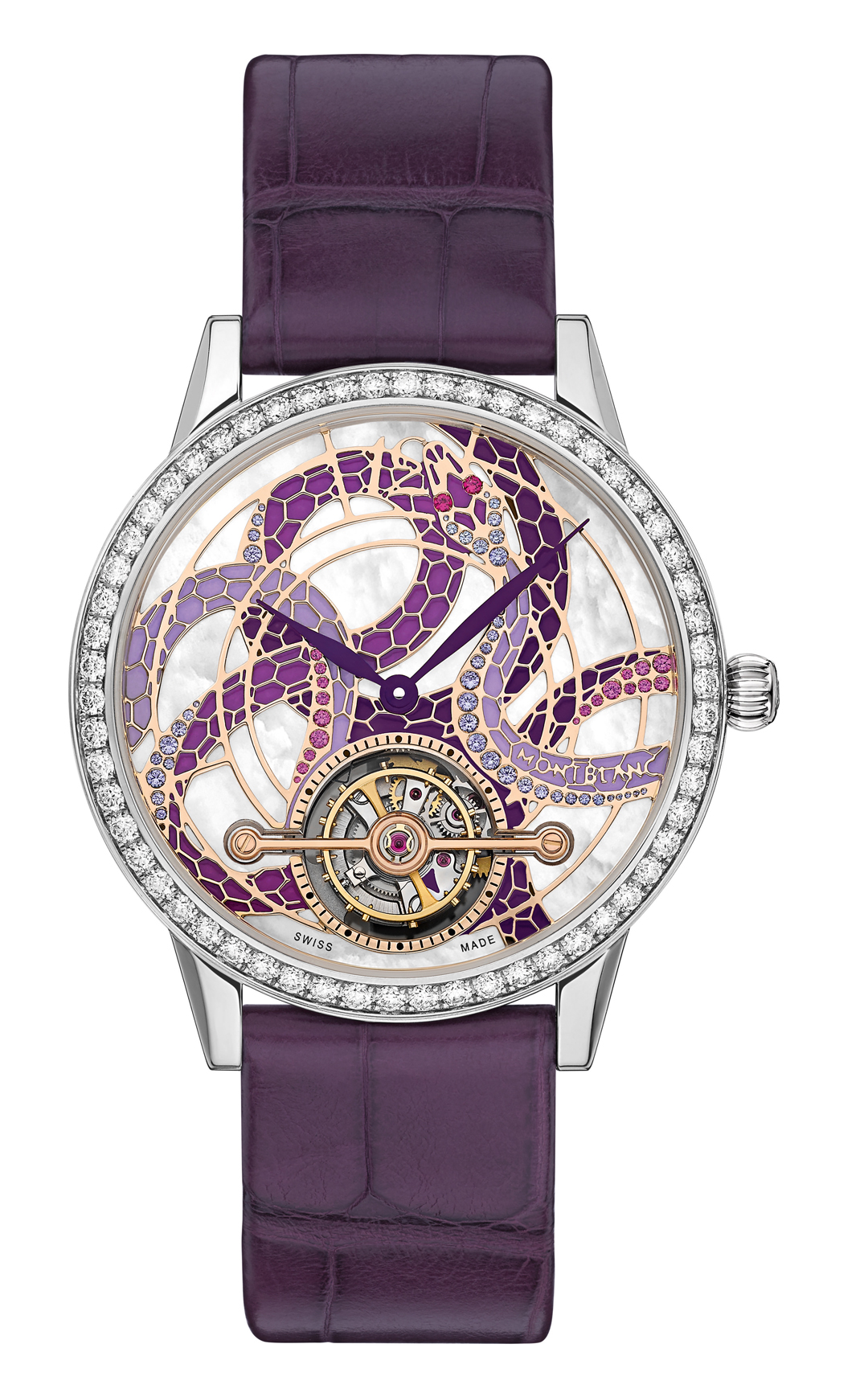 The artisanal dial is handcrafted using shimmering refined white mother of pearl as a base. Adorning the dial, fine gold bands outline the shape and scales of a serpent, expertly hand painted in varying shades of purple and handset with 51 individual blue, rose and purple gem stones, including two radiant rubies for the eyes. Dial accents continue to round out this work of art as leaf-shaped hands and floral inspired Arabic numbers radiate Bohemian nature and style. Bringing the royal color full circle, the Boheme ExoTourbillion comes fitted with a matching purple alligator strap and an 18-karat gold pin buckle set with a dazzling diamond.