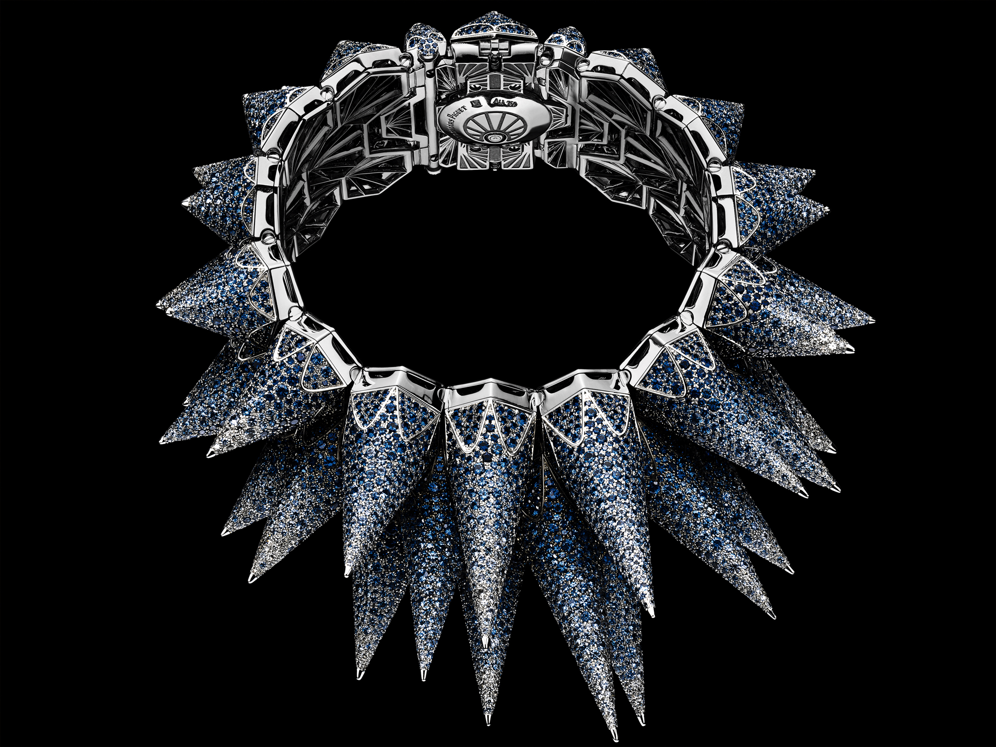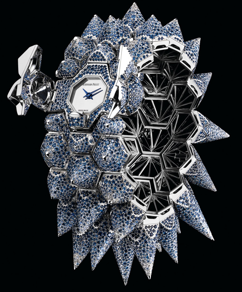 Once again Audemars Piguet demonstrated its exquisite watchmaking talent in the field of audacious diamond timepieces with the more than $1 million Diamond Outrage Sapphire and the $1.25 million Diamond Outrage. The newest watches, unveiled last month at SIHH and causing quite a stir, represent the third and final round in a trilogy of timepieces that have wowed watch and jewelry lovers around the globe. The decadent haute joaillerie timepieces feature 48 gemstone-encrusted spikes along a cuff made of gold. Each spike is designed to emulate icicles.