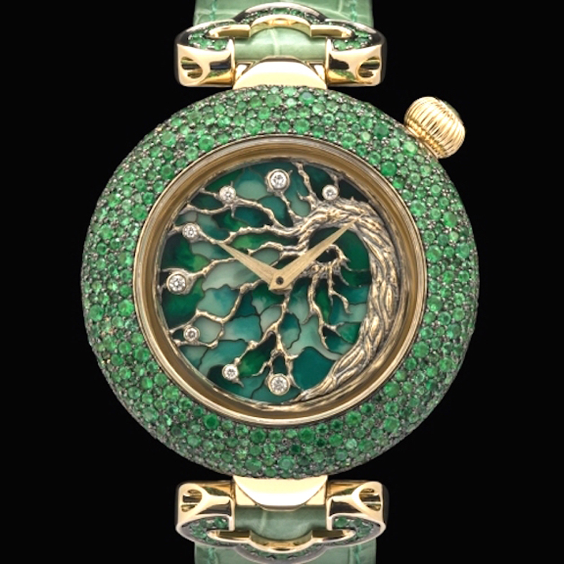 From Kerbedanz, this Tree of Life watch offers powerful symbolism and stunning artistic elegance. The watch features a dial mode of sold gold with gold bas-relief sculpture and cloisonné enamel, set with 8 diamonds that are not only the markers, but also the fruit of the tree of life. Symbolizing spirituality and longevity, the 42mm 18-karat gold case is framed with an incredible 541 green emeralds weighing 5 carats. A mechanical automatic movement based on a Technotime caliber powers the spectacular watch. It features twin barrels and offers 120 hours of power reserve. The watch is finished with a green alligator strap. Just 41 pieces will be made.