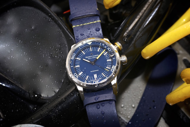Affordability in a dive watch is something truly worthy of attention – especially when that dive watch performs well and looks great. Such is the case with the Maurice Lacroix Pontos S Dive “Blue Devil” watch. Water resistant to a massive 60 atm (600 meters), the watch features screw-down crowns for time adjustment and the internal rotating timing bezel, as well as a helium escape valve so that it can outperform its wearer. The bold Pontos S Diver features a blue dial, the best performing color in deep water. The yellow accent color is a top performing color for the various lighting conditions.