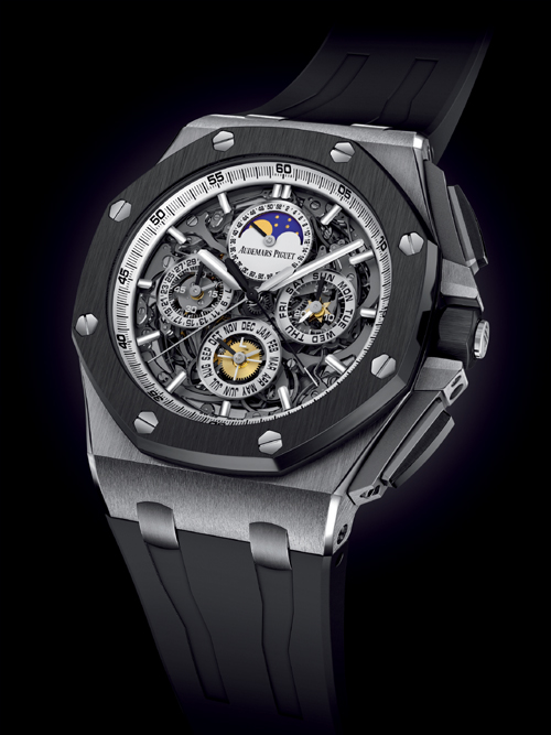 It’s no secret that Audemars Piguet does a marvelous job with its Royal Oak collection. Now, however, it goes above and beyond with this new Royal Oak Offshore Grande Complication. Completely made in house at the brand’s Manufacture in the Valle’e de Joux, the new watch — is equipped with an exception movement. Crafted in titanium and ceramic, the self-winding 44mm watch features a minute repeater, split-second chronograph and perpetual calendar. In all, a total of 648 parts occupy the small space inside this watch case. Some of those parts are beautifully visible via the transparent sapphire dial and caseback, including its solid gold oscillating weight with a black coating. This contemporary beauty is made by a single master watchmaker who puts in more than 700 hours of patient craftsmanship per watch. Just three pieces will be made.