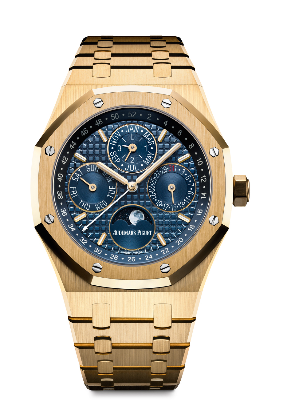As is typical with Audemars Piguet, the brand takes a leap of faith in terms of creativity and technical innovation, and – as is typical of the independently owned and operated Swiss brand – it has come out on top again. I am referring to its release a few months ago of the Royal Oak Perpetual Calendar watch, and I am referring to the fact that in addition to offering the much-coveted complication in stainless steel, rose and white gold – it now announces the appearance of an 18-karat yellow gold version.