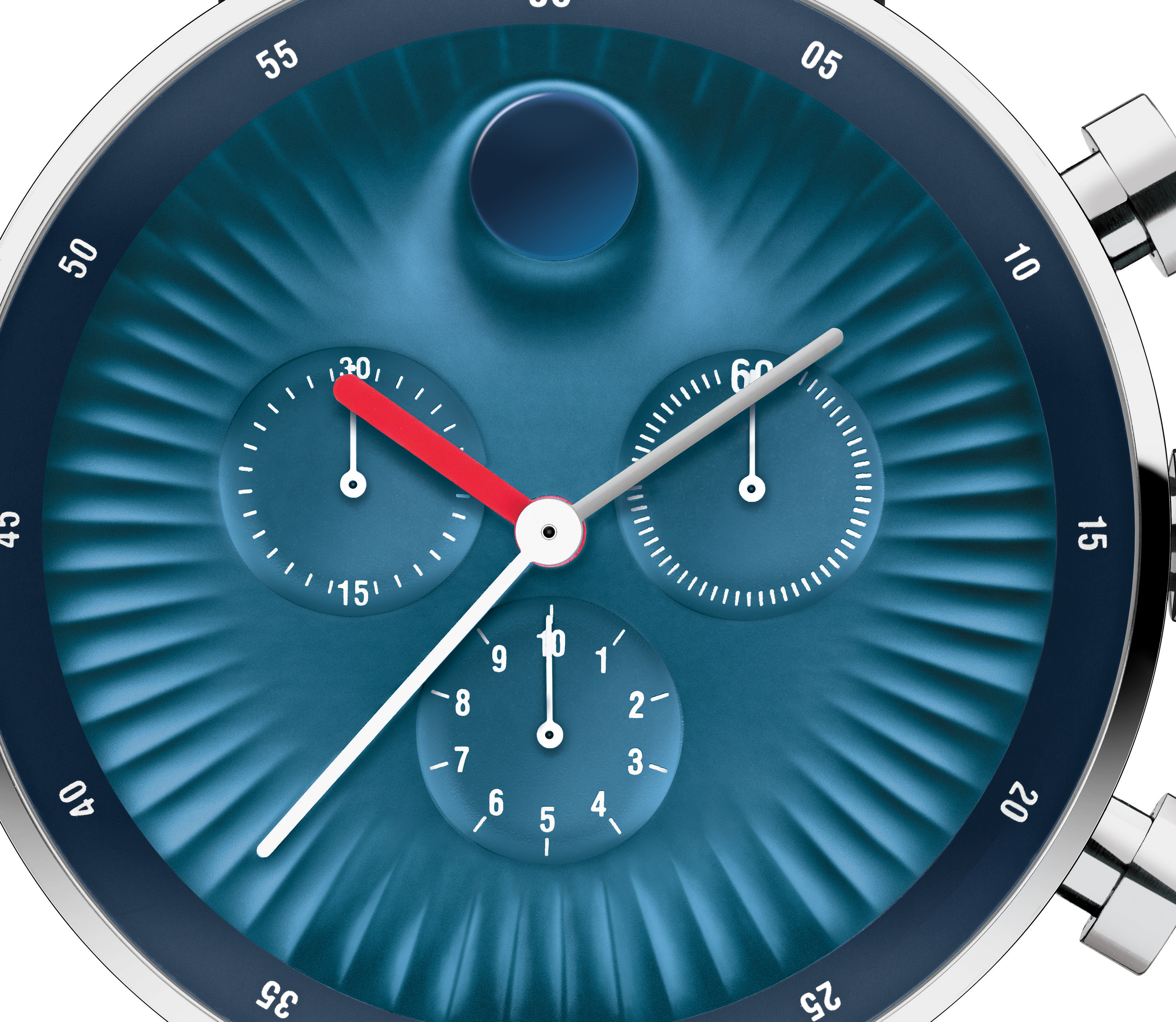 The dial somewhat resembles the look of a volcano, a large round concave structure whose edges have ripples or ridges made over long periods of time. The legendary dot remains a focal point of the dial, but instead of being flat or concave, it is a 3D rendition that rises up out of the dial. Created in a highly polished finish, the dot takes on a life of its own, making the Movado Edge a refreshing delight.