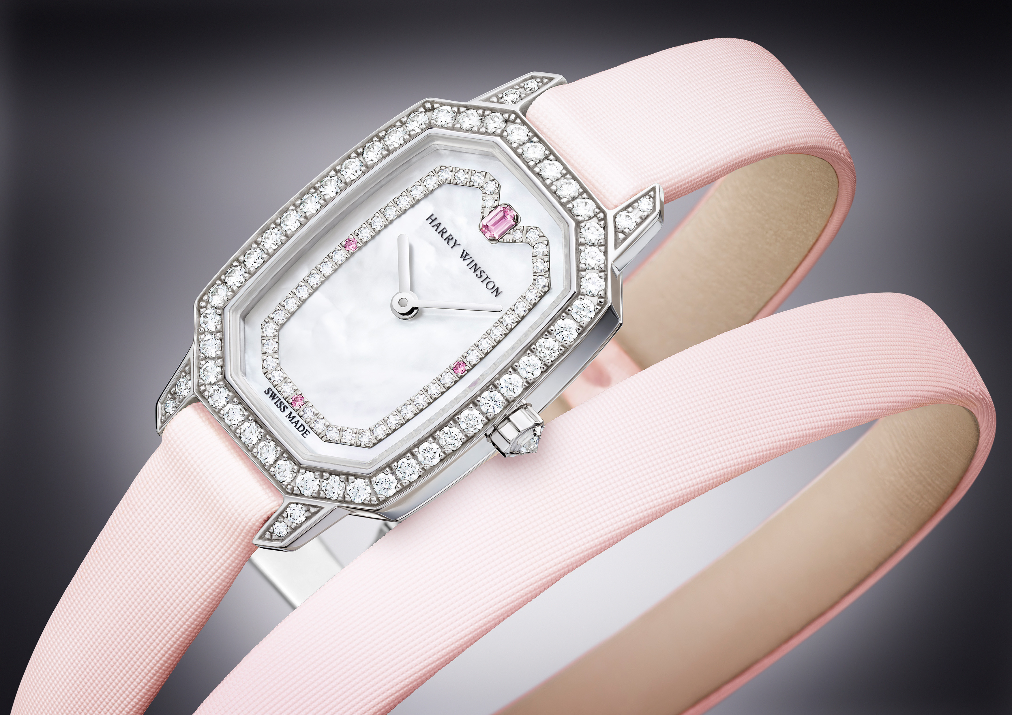 The watch is crafted in 18-karat white gold and equipped with a sapphire crystal with anti-reflective treatment. The satin strap is a pale pink double-wrap, ending with an 18-karat white gold pin buckle set with diamonds. A quartz HW1040 movement powers the watch, which is water resistant to 30 meters.