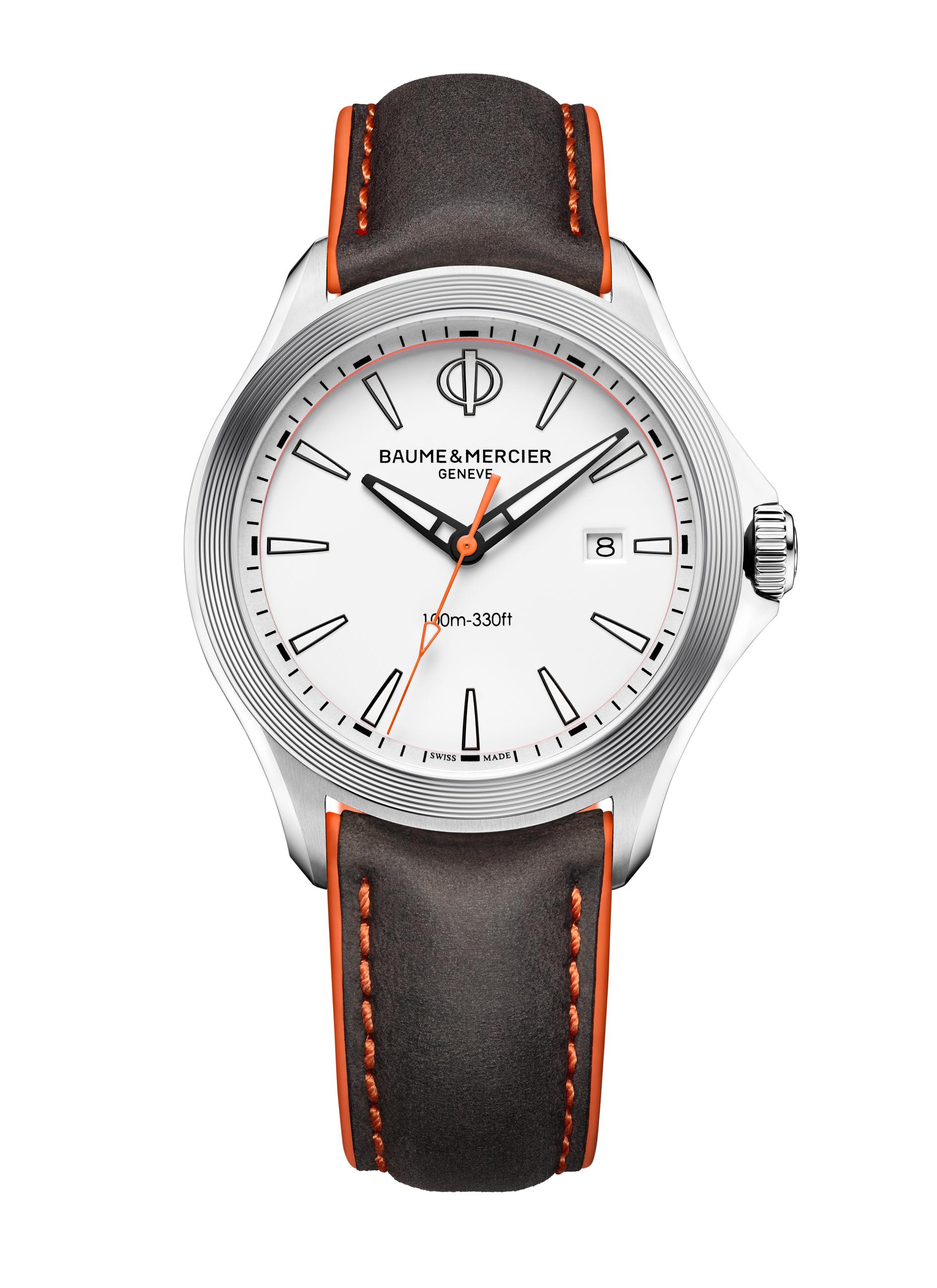 Baume & Mercier Clifton Club quartz watch with white dial and nubuck calfskin strap for the US market