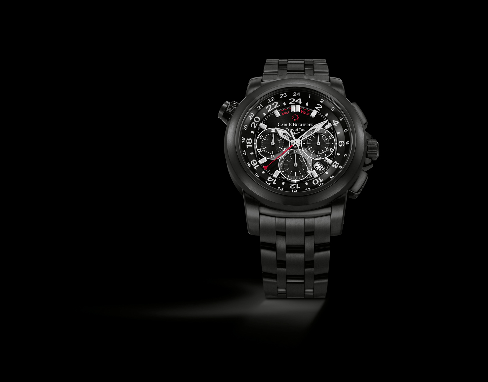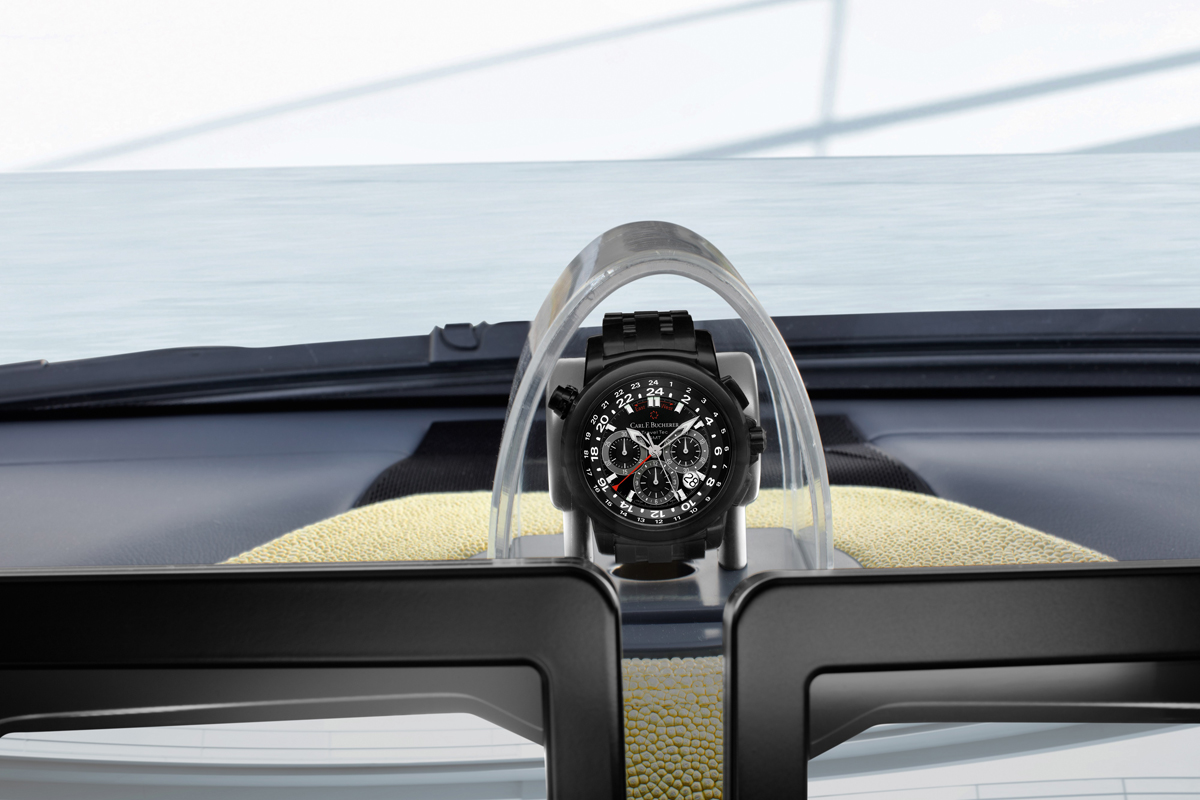The TravelTec simultaneously displays three time zones in combination with a GMT chronograph. Its patented monopusher enables the wearer to switch back and forth between East and West travel directions. Powered by the CFB 1901.1 certified chronometer movement, the watch is a blend of precision and technology. It utilizes cutting-edge materials that also make the timepiece appealing to Rinspeed, including the wafer-thin crystalline carbon structure that ensures shock and scratch resistance.