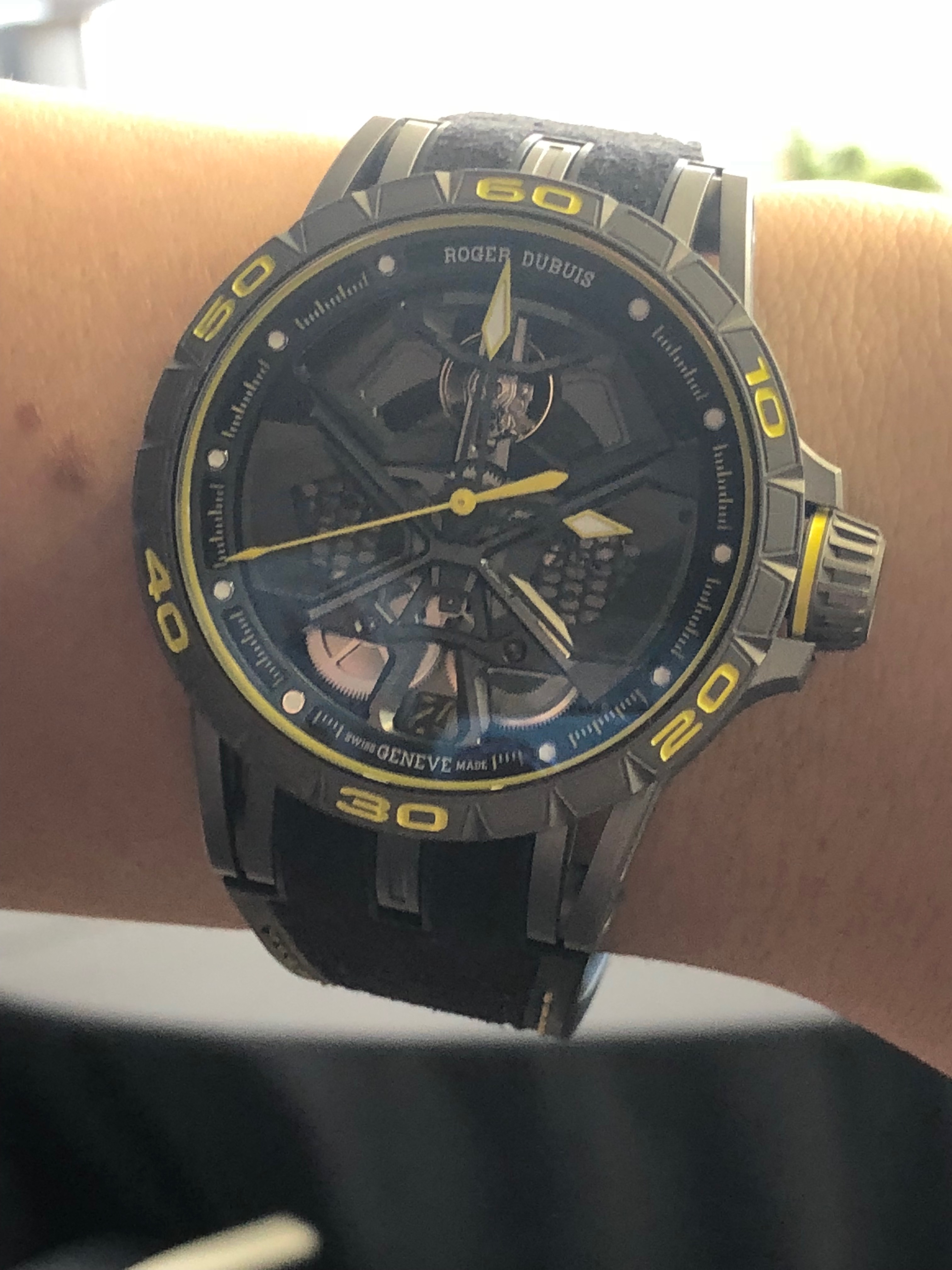 Interestingly, the Excalibur Aventador S timepieces and the Excalibur Spider Pirelli watches feature straps made using winning Pirelli tire rubber. Roger Dubuis had formed a partnership with Pirelli in 2017 to create straps using winning tires only for its Spider Pirelli line.