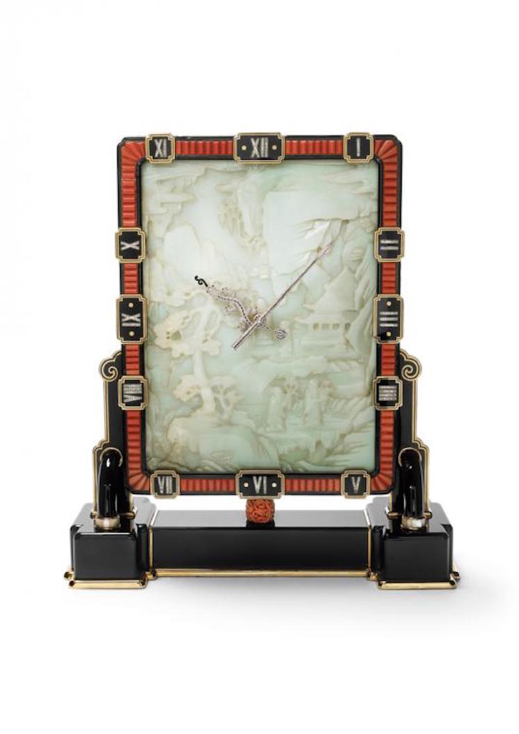 To the Chinese, nature is a source of wisdom. Made by Cartier Paris in 1926, the magnificent clock pictured above features a base of onyx holding a dial of white jade intricately carved with a Chinese landscape scene surrounded by a frieze of coral rods. The roman numerals are made of platinum and rose cut diamonds, as are the hands, one of which is shaped like a dragon. The clock features an 8-day movement, Swiss lever escapement, bimetallic balance, and Breguet balance spring.
