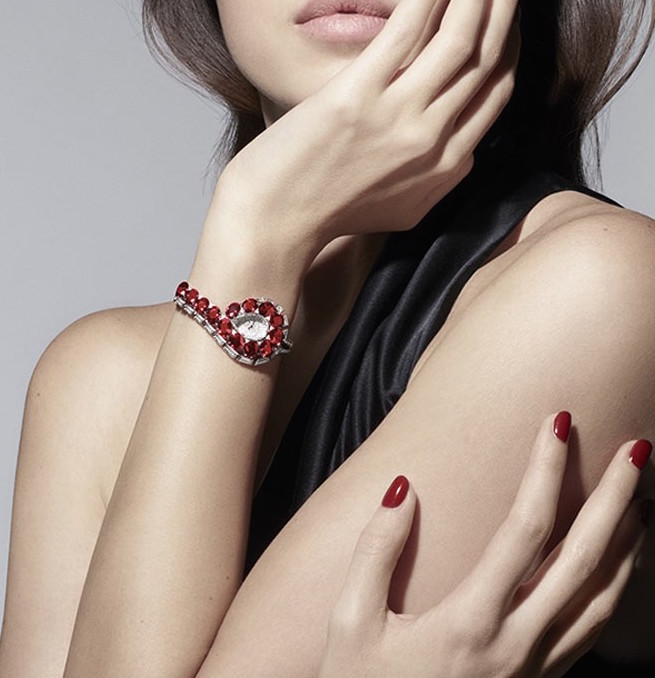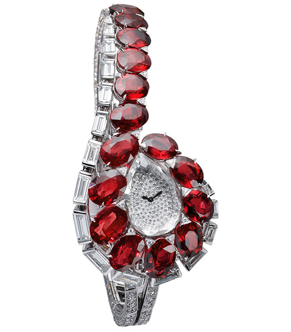 In the new Trait d’Eclat watch, 15 round Burmese rubies — weighing 24.93 carats — are set alongside diamond baguettes on the bracelet and come into a fine feminine oval that wraps itself around the stunning tear-drop-shaped watch dial that is also magnificently set with diamonds. The cuff style bracelet watch is magnificent dance of geometrics, with rectangular baguettes, round rubies and a tear-drop center. It is a look Cartier mastered in the roaring twenties and the Art Deco era — geometry, symmetry, haute color and dynamic appeal — only it is now updated for the 21st century.