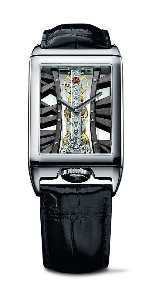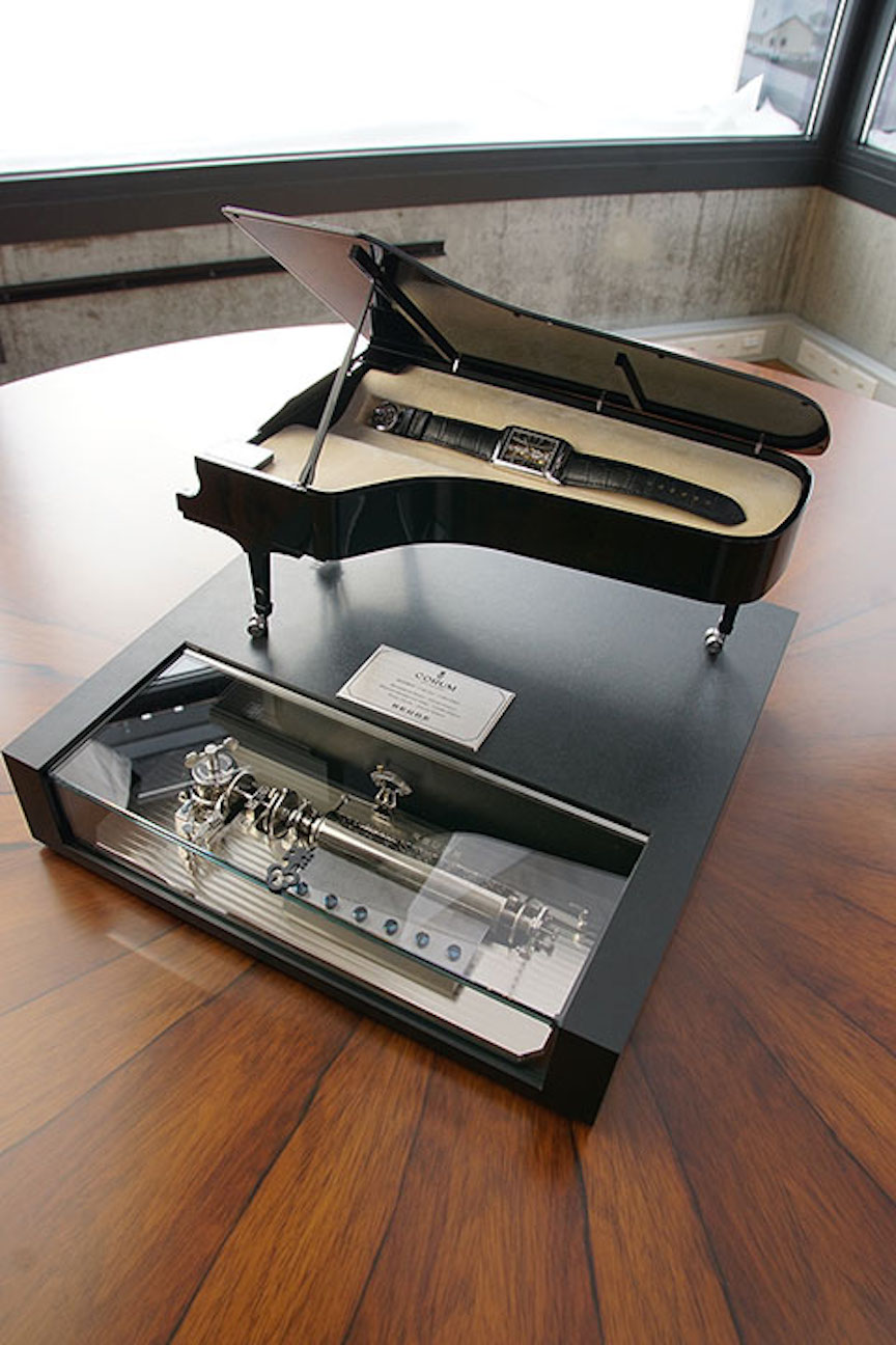 To ensure the best possible presentation case for the The Golden Bridge Rectangle Joachim Horsley watch, Corum turned to Swiss music box maker Reuge, which design a music box that plays three melodies by Bach, Mahler and Beethoven, that have been re-arranged by Horsley as rumbas or Cuban- inspired tunes.
