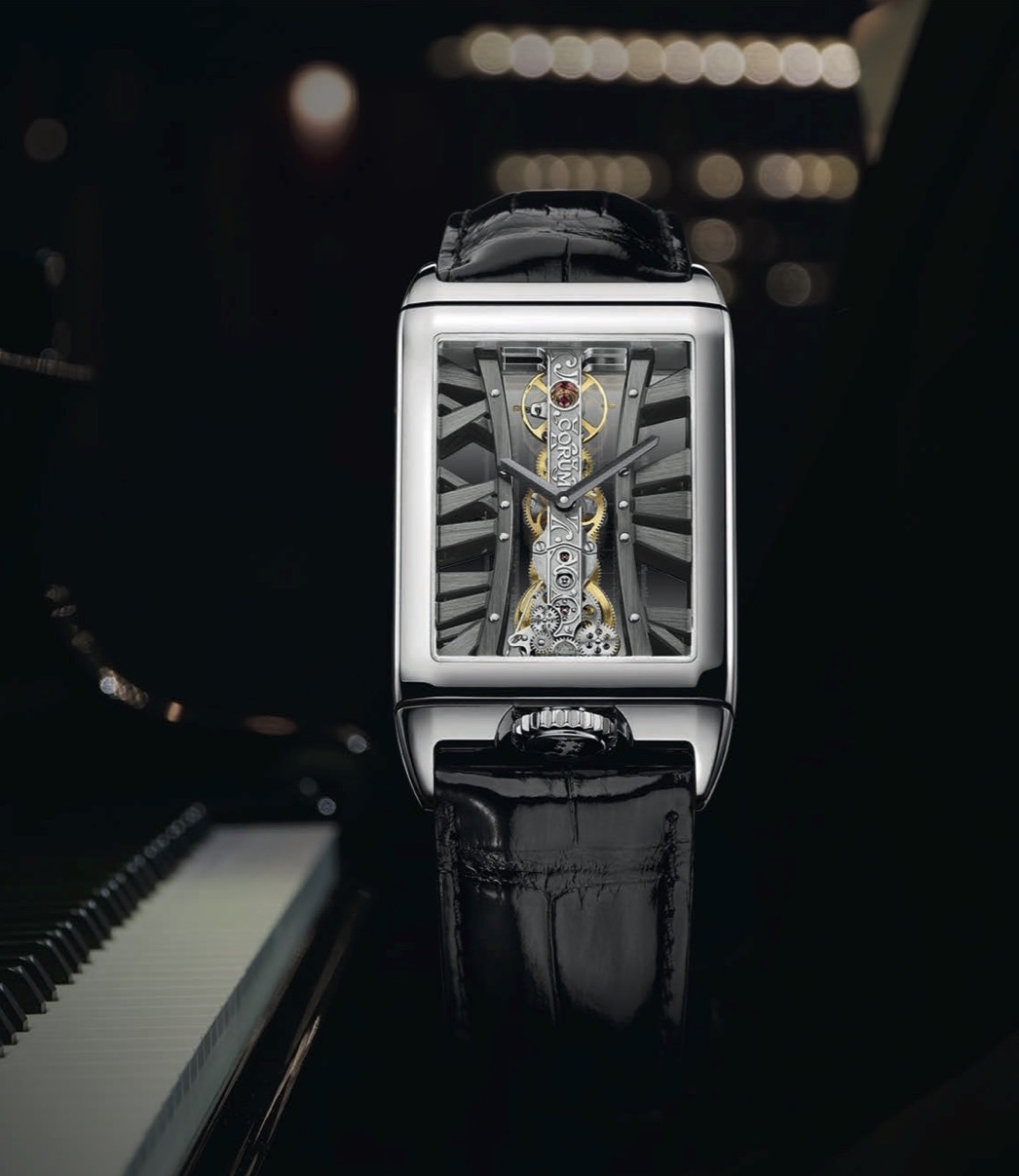 The Corum Golden Bridge Rectangle Joachim Horsley watch features part of a score of music with metallic notes on the caseback