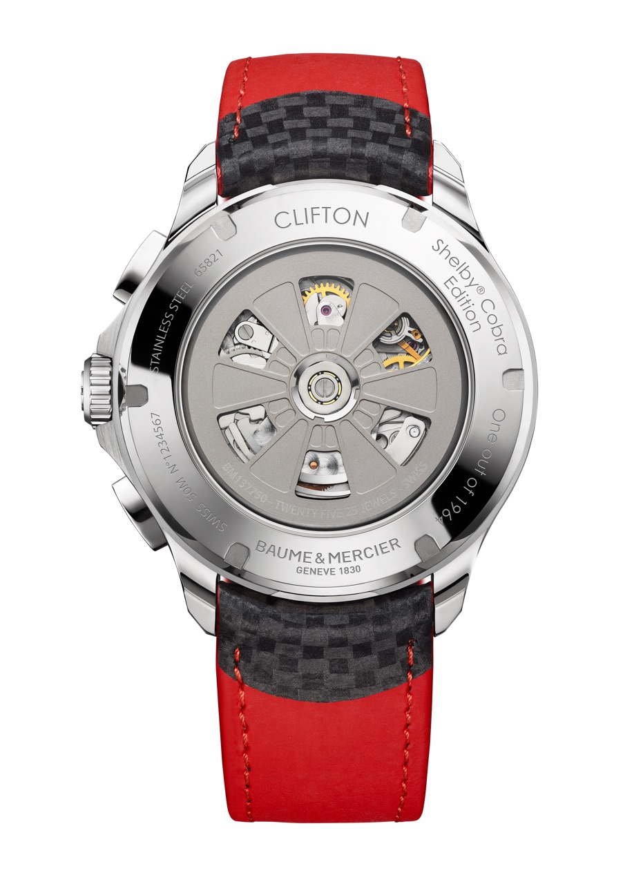 The caseback of each of the Baume & Mercier Clifton Club Shelby Cobra editions watches has the number engraved on the case back and features the oscillating weight made in the likeness of the Daytona Coupe’s alloy wheels.