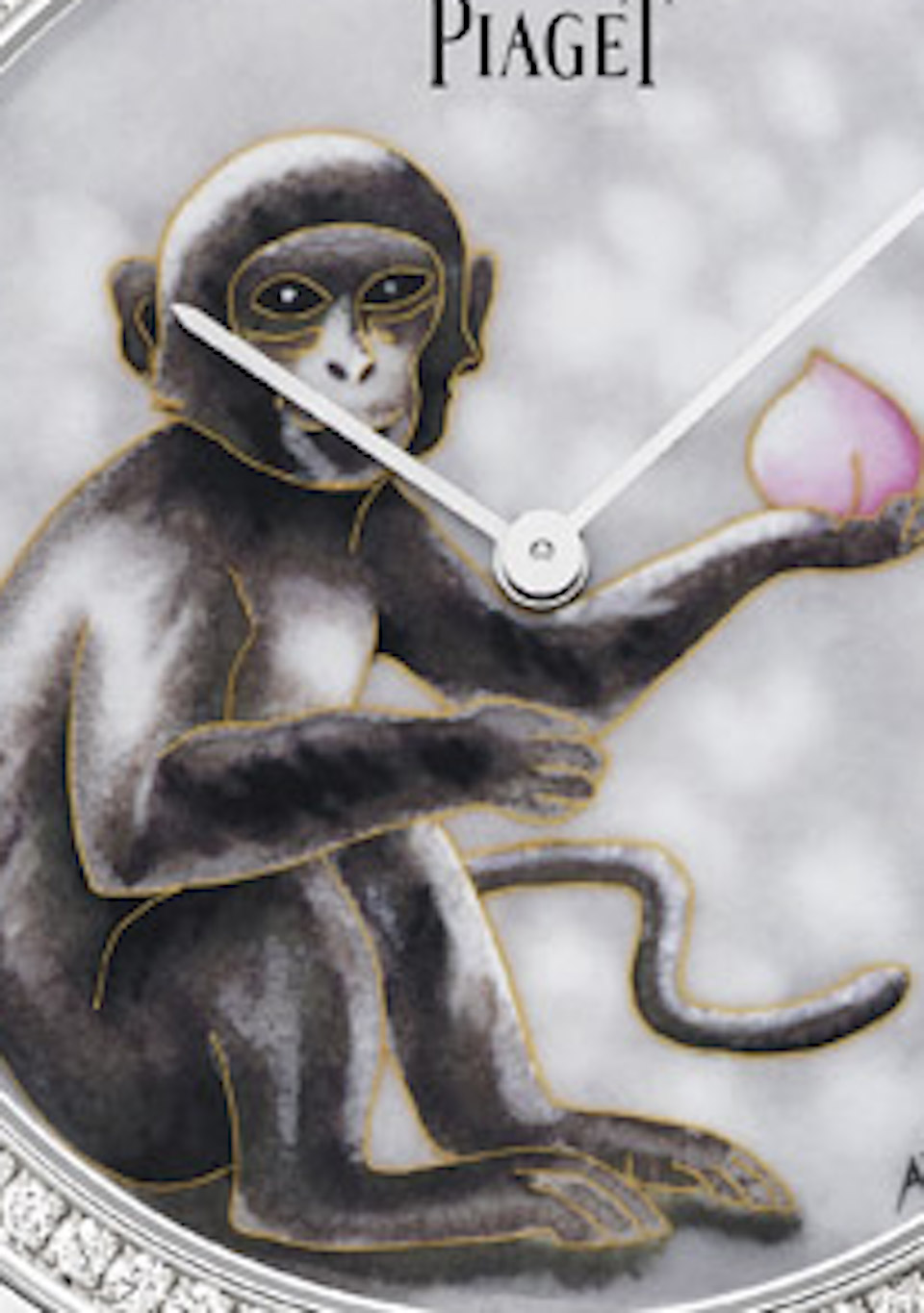 For the creation of this watch, Piaget turned to renowned master enameller Anita Porchet, who has brought the previous Chinese zodiac, signs to life for Piaget (dragon, serpent, horse, goat). Porchet uses cloisonné (the art of partitioning the enamel colors between thin lines of gold) for a more intense color hue and distinctive shading of gray for the monkey to attain its fur coat. In his hand he holds a peach, the symbol of immortality.