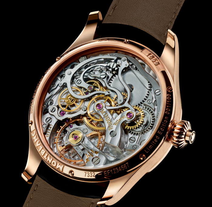 The 1858 Chronograph Tachymeter deftly combines elements of the past with today’s technology for a truly attractive watch. From the outside, the watch is a stunner—crafted in 18-karat rose gold with a black dial and characteristic-of-the-era large Arabic numerals. The chronograph subdials are displayed horizontally, with the chronograph minute counter at 3:00 and the running seconds at 9:00. At the 12:00 position, the bold Montblanc logo is derived from the historical brand emblem – complete with the Montblanc mountaintop breaking up the two-syllable name.