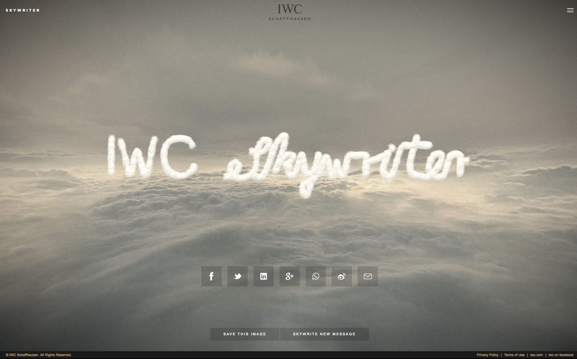 The new global digital campaign by IWC, Skywriter invites users to create sky written messages online. To write the messages, one of four vintage airplanes associated with four different pilot watch lines must be selected. The four watch lines used are the Big Pilot, the Perpetual Calendar Digital Date-month and the Pilot Watch Chronograph. Once you have chosen your plane, the user must then fly it through a series of rings to write the word.
