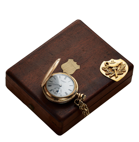 James Dean bought this watch used in 1951 while he was still a struggling actor working in New York. It was his first big buy and he had his initial engraved on the gold cover. He considered it his good luck charm and wore it while performing. He got his big break shortly thereafter when he was called to LA for “East of Eden.” James Dean’s father gave Dean the chain from his own pocket watch so that the watch would never be lost.