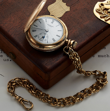 The American made watch goes up for auction the day after tomorrow at the Important Modern & Vintage Timepieces auction by Antiquorum Auctioneers. Although the auction is being held in Hong Kong, you can register now and bid on line. The watch is an Elgin pocket watch that belonged to this legendary actor who inspired so many.