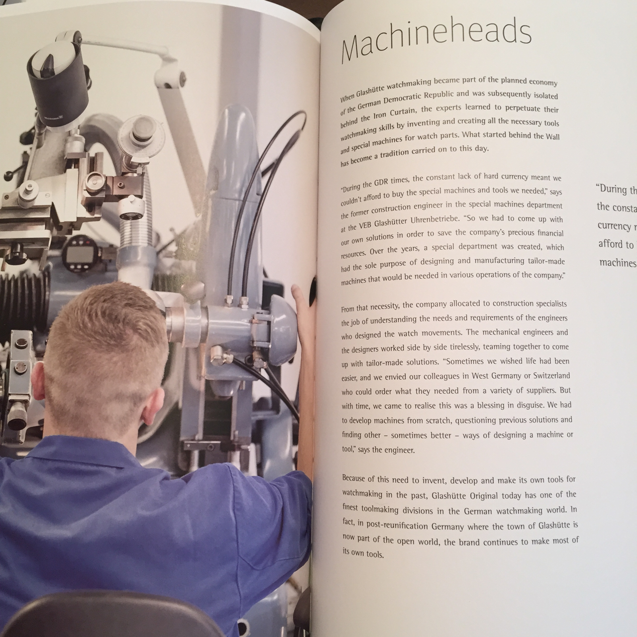 The idea behind Impressions is to pay tribute to the history of the brand and to the cultures and people who made it successful. “Impressions is not only a portrait of our manufactory, but a tribute to the rich history of the region and the outstanding skills of the people who work and live here,” said Yann Gamard, CEO of Glashütte Original. Among the topics in the book are the original cottage industry, the economic and political climates that impacted the brand, and a look at the brand’s self-taught technical watchmaking know-how. In fact, one of the topics I was presented with, and was published in the book, was a close up look at how the brand preserved its traditional skills and knowledge, and how, during the GDR era, without access to the technical advances of the Western World, the brand learned to invent and create all of its tooling to perpetuate the watch making industry.