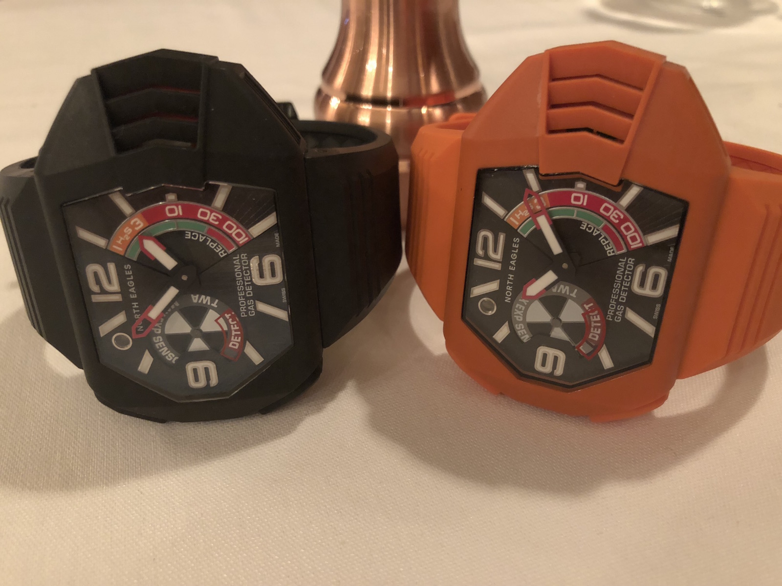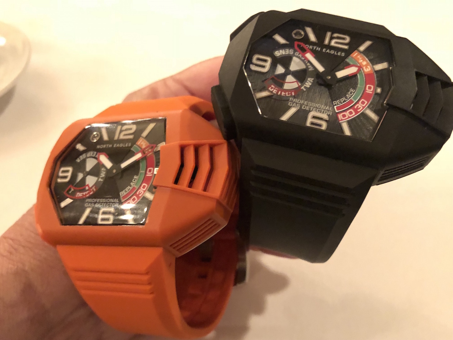 Typically, on an oil rig or in other gas/oil industry situations, everyone is equipped with a gas detector that clips onto the vest or shirt. The watch — a device that generally doesn’t come off the wrist — may be a more powerful tool for a multitude of reasons. First, you wouldn’t just put it down — during lunch, for instance — and walk off without it, as you could with a clipped device. Secondly, according to North Eagles, the wrist has a larger “wing span” and so as one moves around, the watch can detect gas in a slightly larger range than the stationary clipped device. Additionally, the wrist is typically lower than the clipped vest device, and may detect gas (which rises from below) sooner than the stationary safety device.