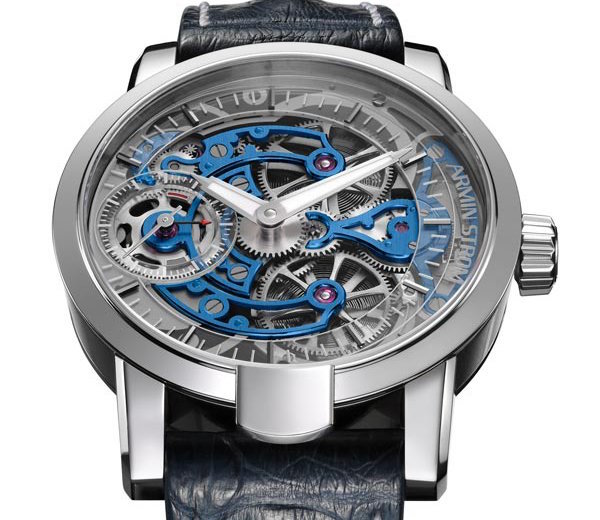 Seen at WatchTime New York, the Armin Strom Skeleton Pure in white gold houses the Calibre ARM09-S with bridges are highly accentuated in bold blue thanks to a special three-dimensional PVD
