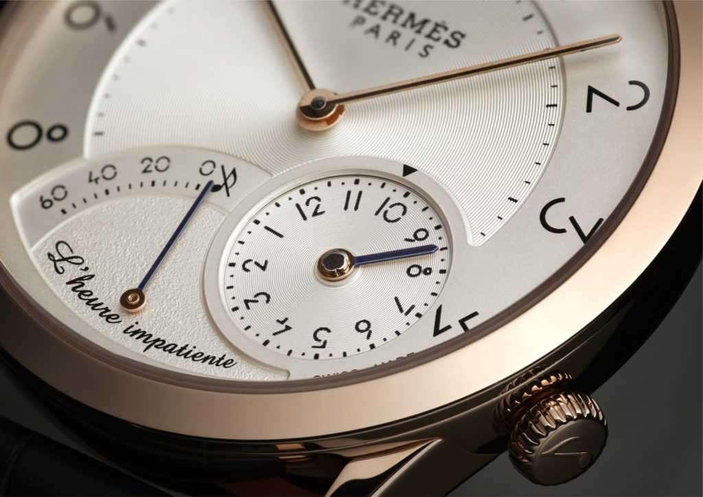 The subdial at 5:00 is where the time is set, and the subdial to its left at 6:00 offers the countdown on the Hermes Impatient Hour watch.