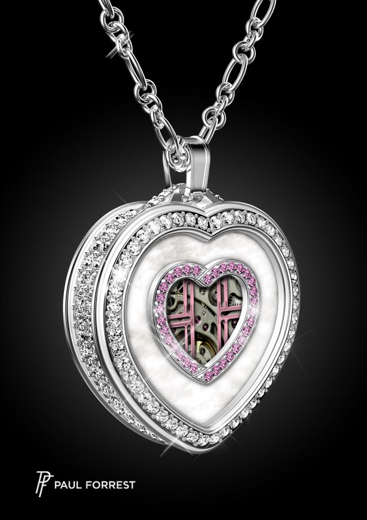 Earlier this year, in April, we broke the news here about Paul Forrest Co. — a luxury jewelry company producing pendants using watch movements to power them. The Heart’s Passion collection is the brainchild of a man who has been around the watch industry for years: Paul Forrest Hartzband. Since I have also been around the industry for years, it turns out, I knew his family, so we discovered during a face-to-face meeting just about two years ago to talk about his launch of the brand. Having been in this wonderful industry for three-and-a-half decades, I love when I see something truly new. And with the line Paul was showing me, that something new came in the form of a stunning pendant necklace with a center heart motif that moves. The patented movement of the heart — with the two halves moving apart and back together almost like a heart beating — is the Magnificent Motion complication and we can expect to be seeing a lot more of it. In fact, the jewelry is making its way to stores, as I write this post. It was so different that I knew I wanted to be a part of it. This is how I helped. When I saw the collection — in drawings only, mind you — I was really excited, so I jumped right in, working closely with Paul Forrest Co. to create the “Heart’s Passion” name, the “Magnificent Motion” name, and the tag line “Key to your heart.” I also developed the website copy and to lent a host of other ideas to the brand for the launch.