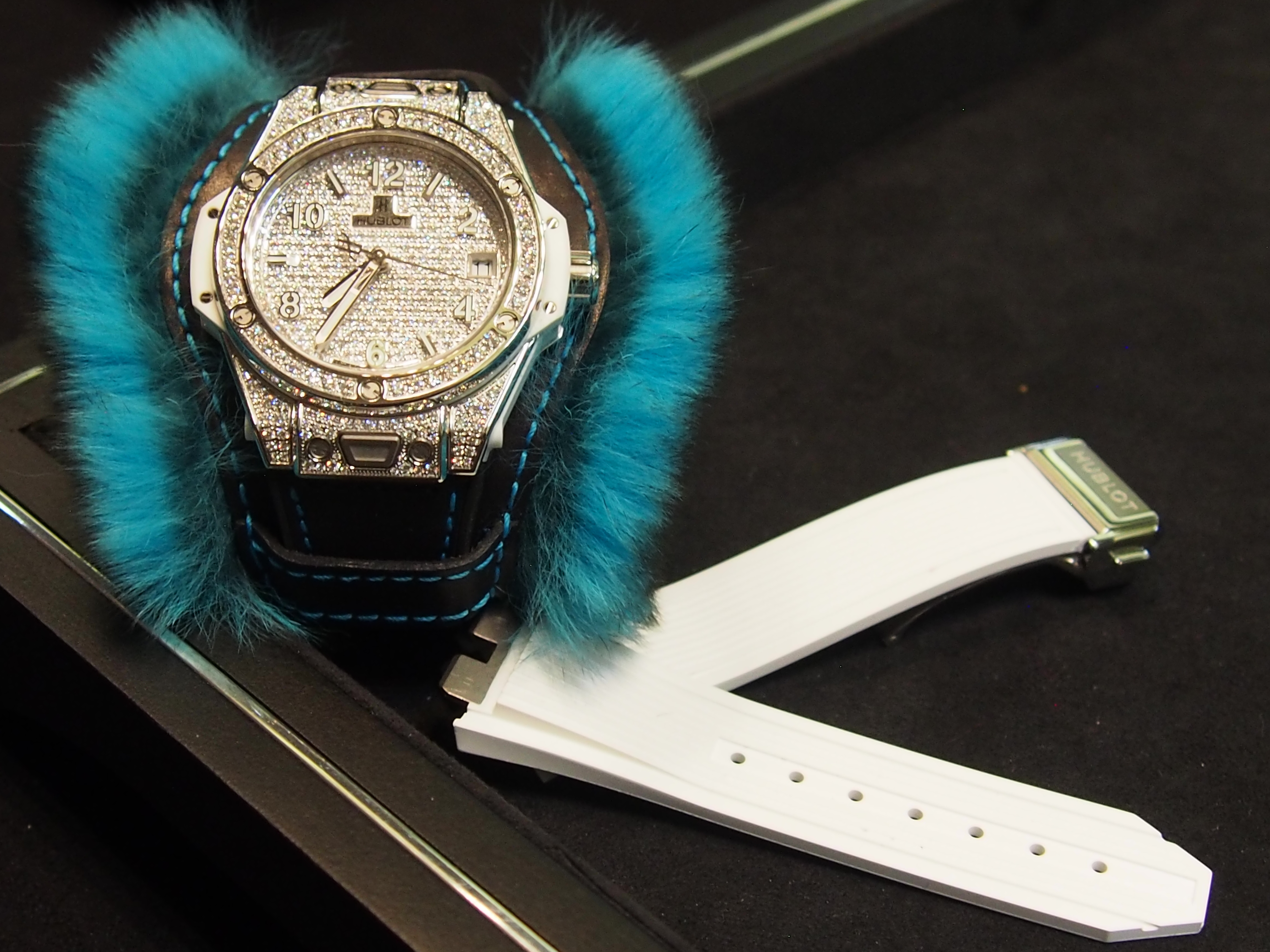 Hublot sells the Big Bang “One Click” Cuddly cuff watch with an interchangeable rubbers strap for daytime wear (Photo: R. Naas)