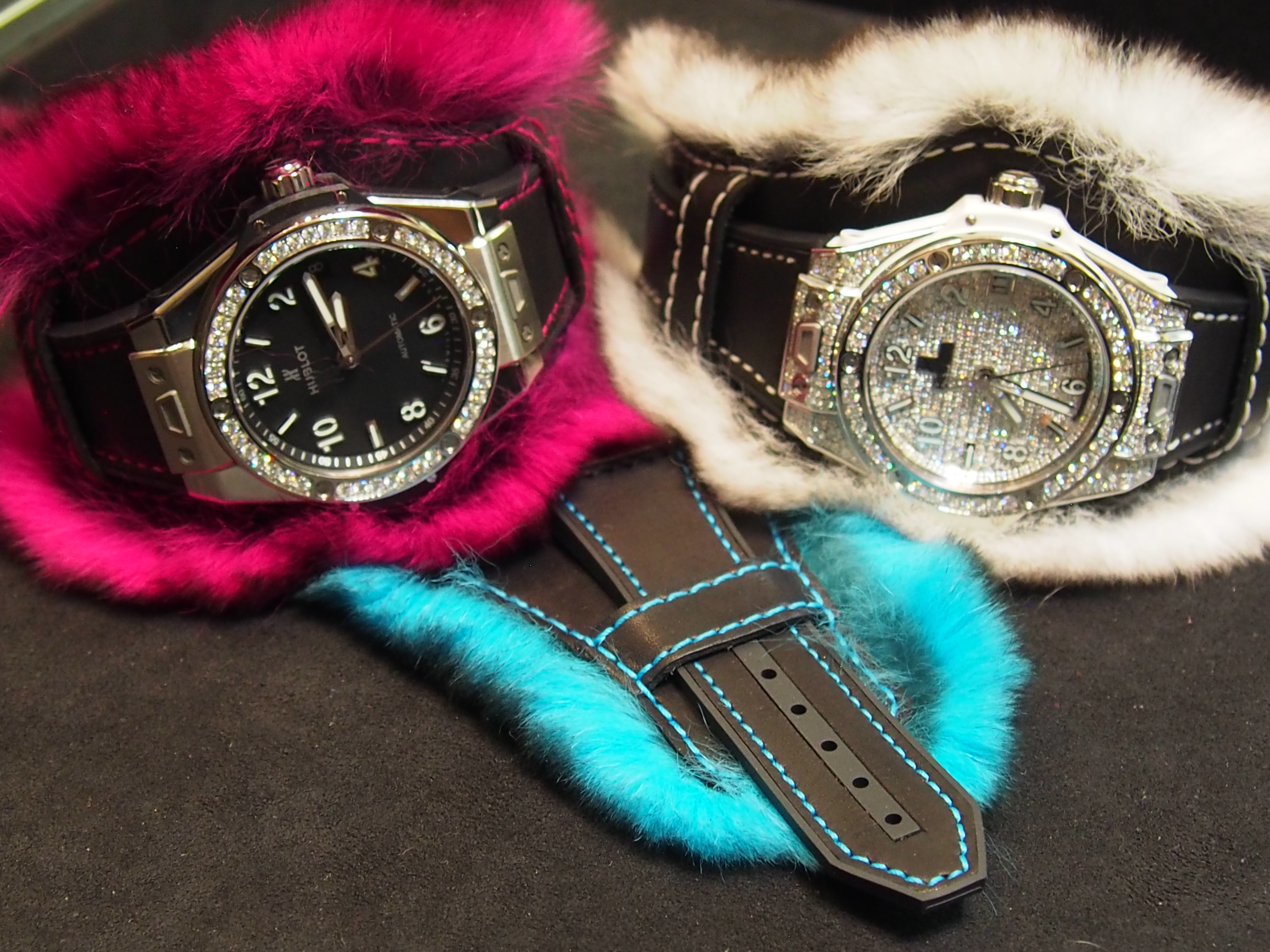 To create the strap, Hublot turned to a fur specialist in France who has worked natural rabbit hairs (from ethically bred rabbits bred for top chefs) to accept dyes. The Cuddly Cuff straps are offered in a variety of colorful hues, including fuchsia, electric turquoise, and a mottled gray/black/white. The exceptional Orylag© is the result of research by INRA (National Institute of Agricultural Research). The Cuddly cuff watches are powered by HUB1710 automatic movements with date, and are water resistant to 100 meters.