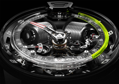 The H2 boasts a 48mm black DLC titanium case and a domed sapphire crystal to accentuate the three-dimensional depth. The watch is built with a double barrel to offer eight days of power reserve. The barrel spring is visible and the power reserve is displayed in an innovative manner via the open-worked barrels. The driving force behind this watch: two flexible reservoirs, with a capillary or vein at each end, containing two different liquids. In one is an aqueous liquid containing the florescent fluourscein. In the other, a viscous transparent liquid resides. The two bellows are moved by a piston. When the first is compressed, the other is extended, driving the movement of the fluids in the capillary. The meniscus marks the separation between the two tubes and displays the time. When it reaches 6:00 pm, the fluorescent material returns to the original positions thanks to a retrograde movement. The entire complex watch demonstrates a fusion of liquid mechanics.