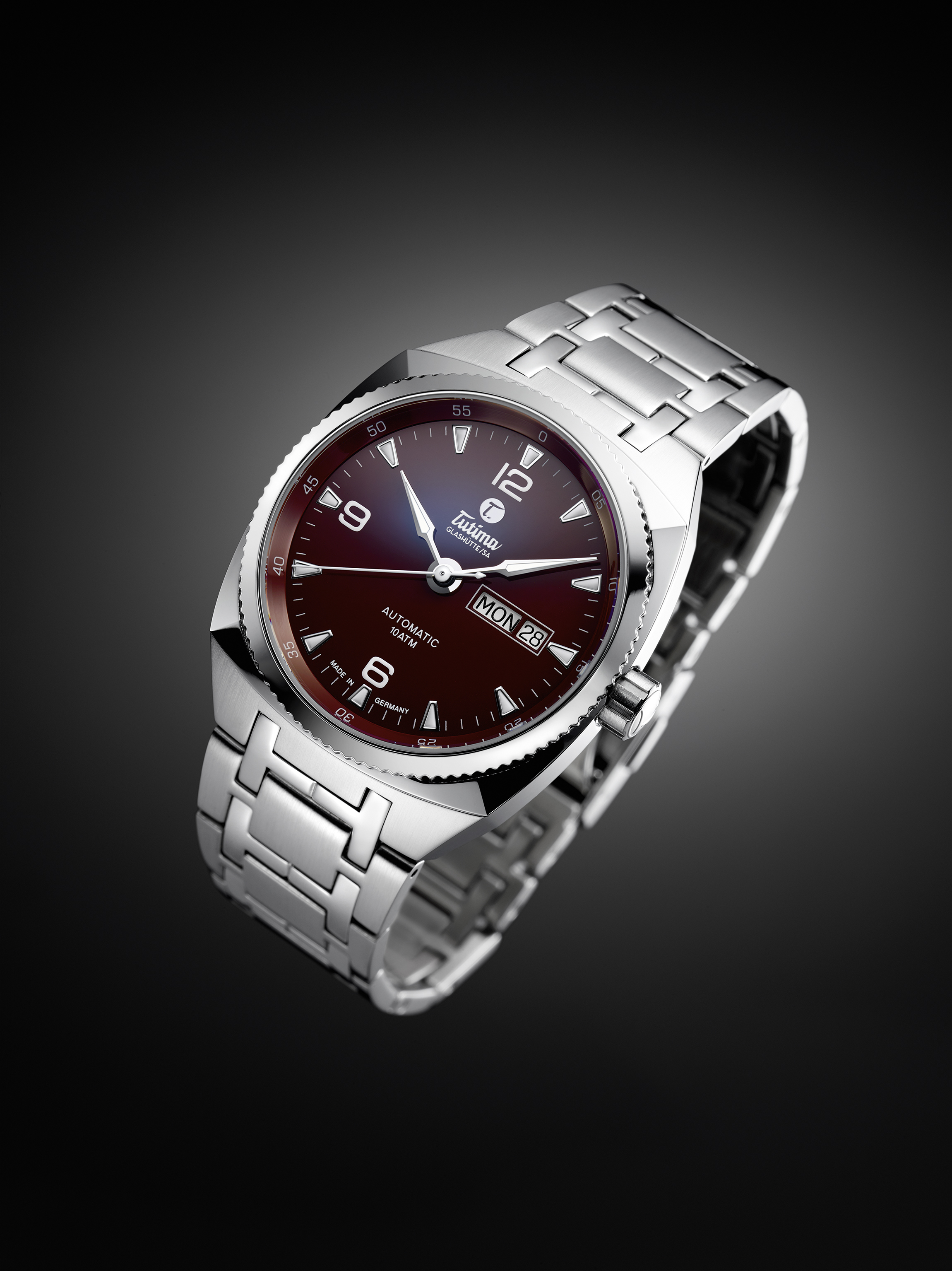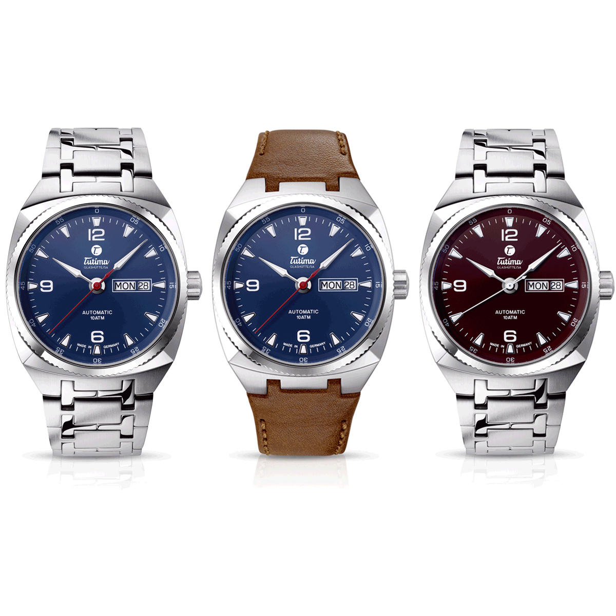 Representing an entry level Tutima watch, the Saxon One M is offered in stainless steel with either a rich Steel Blue or Maroon Brown colored dial. Made in Glashutte, the Tutima Saxon One M is powered by the automatic caliber Tutima 330 with rotor featuring Tutima’s seal in 18-karat gold. The watch offers day of the week, date, hour, minute and central second hand. The German-made movement is visible via a sapphire case back and the case is water resistant to 10 bar.