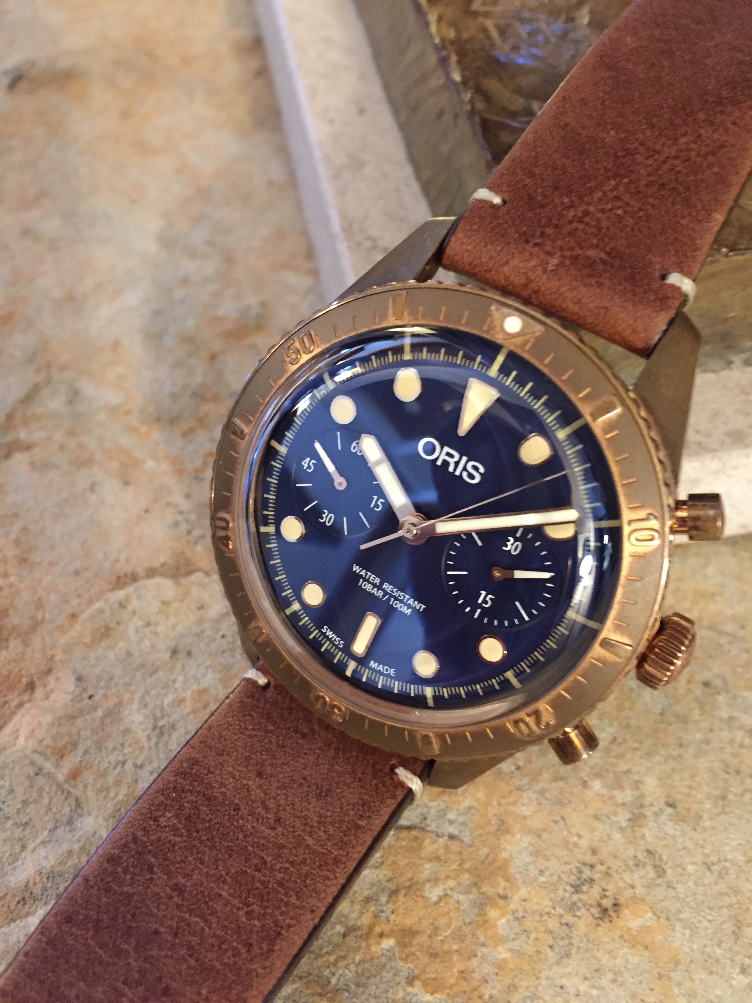 Bronze watches have picked up in popularity over the past several years. The reasons for the popularity for both enthusiast and manufacturer stem from the fact the metal patinas naturally over time and ages according to the ph levels in the wearers perspiration. It gives a great vintage aesthetic and a piece that is unique specific to the owner. The inspiration for bronze in this particular piece is done to pay homage to the early diving equipment Brashear used which was also made of bronze.