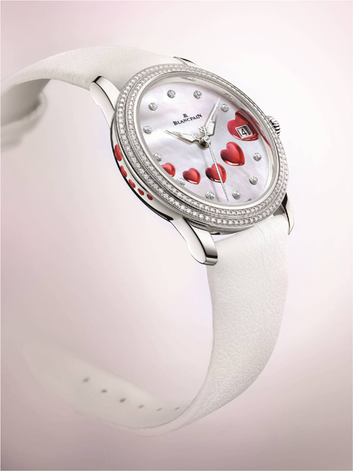 Blancpain‘s Saint-Valentin 2013 model with its colors and gemstones inspired by the universal symbols of love features a flurry of hearts, together with a subtle play on textures and shapes. The white mother-of-pearl dial is enhanced by diamond hour-markers and five red-lacquered mother-of-pearl marquetry hearts. The 34 mm steel case features a bezel set with two rows of full cut-diamonds. The case side, at 9:00, is adorned with five liquid ceramic hearts. This technique calls for meticulous application of the liquid matter prior to a firing process that solidifies it. This three-hand model is equipped with a mechanical self-winding Caliber 1150 endowed with 100 hours of power reserve. The white strap is ostrich leather. The Saint-Valentin 2013 model is issued in a 99-piece limited edition. Each watch retails for $21,200.