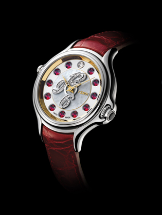 From Fendi – a brand women love – red is the color of the month. In fact, the brand unveils its red-strapped revolutionary Crazy Carats watch. The Crazy Carats line features a patented rolling gemstone mechanism that enables the wearer to change the color of the gemstone markers on the dial with the turn of a crown. The Crazy Carats Two-Tone Saint Valentine’s Day watch is set with 11 red topaz gemstone makers as the highlighted choice for this romantic day. Blue topaz and green topaz markers comprise the other two gemstone color choices. Stay tuned for more.