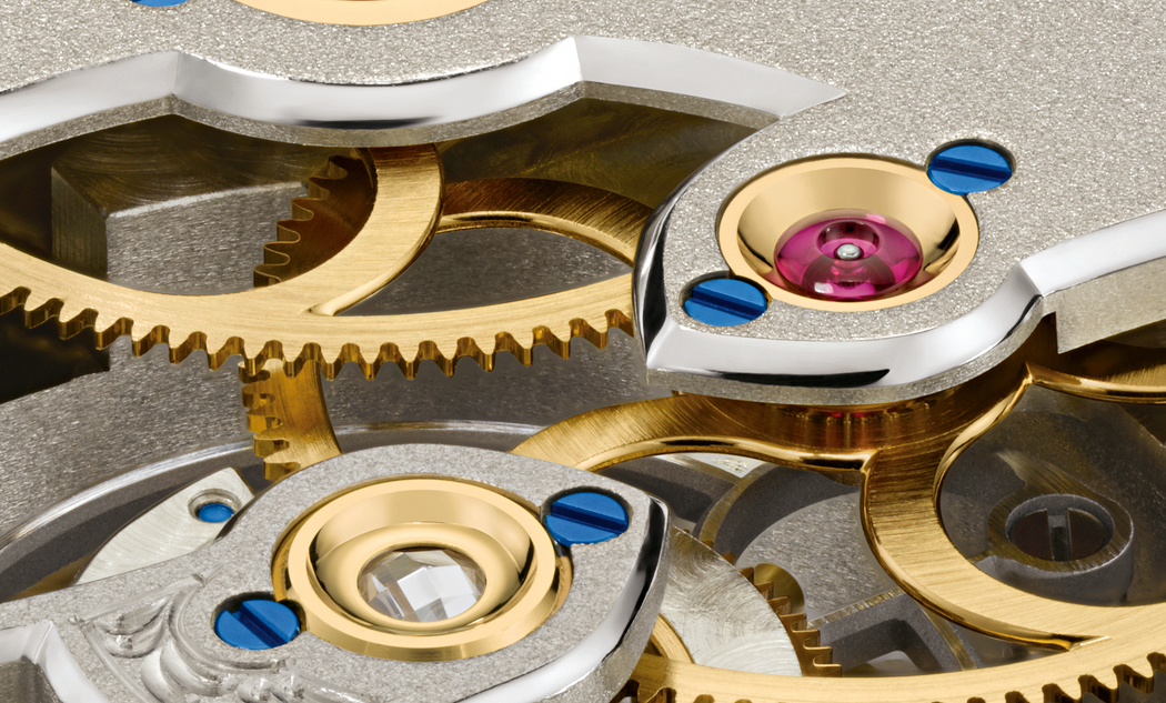 Powered by the L102.1 Manufacture caliber with granular surface three-quarter plate, the watch’s large one-minute tourbillon with patented stop-seconds is visible via an aperture at 6:00. Additionally, the tourbillon bridge and upper portion of the cage are also black-polished – an extremely time-consuming and lavish process. The watch is precision adjusted in five positions and features plates and bridges made of untreated German silver, inspired by historic pocket watches. The movement consists of 262 meticulously finished and hand-assembled components, including a lever escapement, 21 jewels (one being a diamond end stone) and five screwed gold chatons.