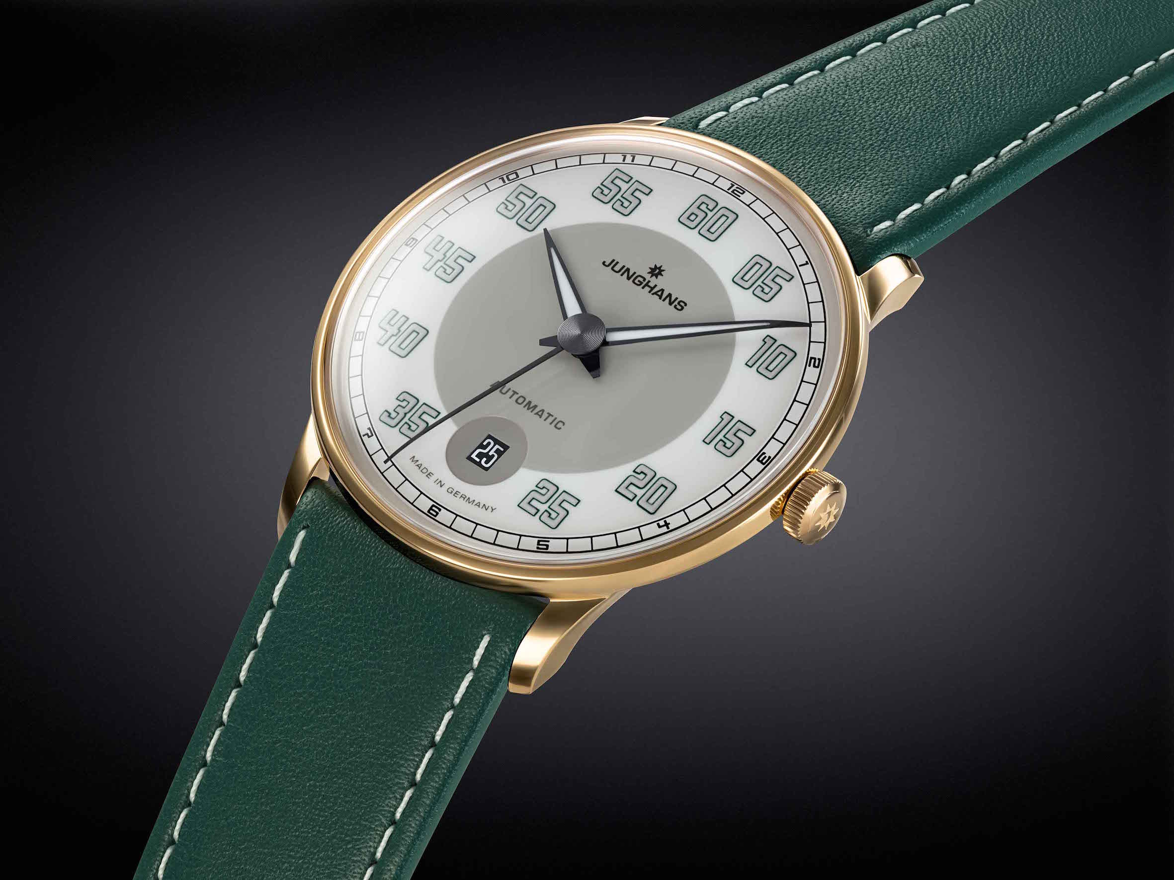 For the Meister Driver Automatic, Junghans has sought to capture the essence of the culture through astute color selection, as well as refinements and font selection for the numerals around the dial. Two colors ways have been produced: green and brown. For the green, British Racing Green is the dominant color, while the brown hue is meant to recall the leather cap and driving goggles of the race-loving gentleman. Both color options are housed in a gold–plated case measuring a refined 38.4mm.
