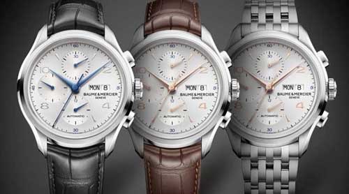 chronograph offers day/date indication and features sapphire caseback for viewing the self-winding mechanical ETA 7750 movement. The three versions include one with blue hands and a black alligator strap, one with rose-gold hued hands and digits on a stainless steel bracelet, and a similar model offered on a brown alligator strap. The strap versions sell for $3,900, while the bracelet model retails for $4,200. Like all Baume & Mercier timepieces, the value to quality ratio is superb and these watches warrant an up-close and personal look.