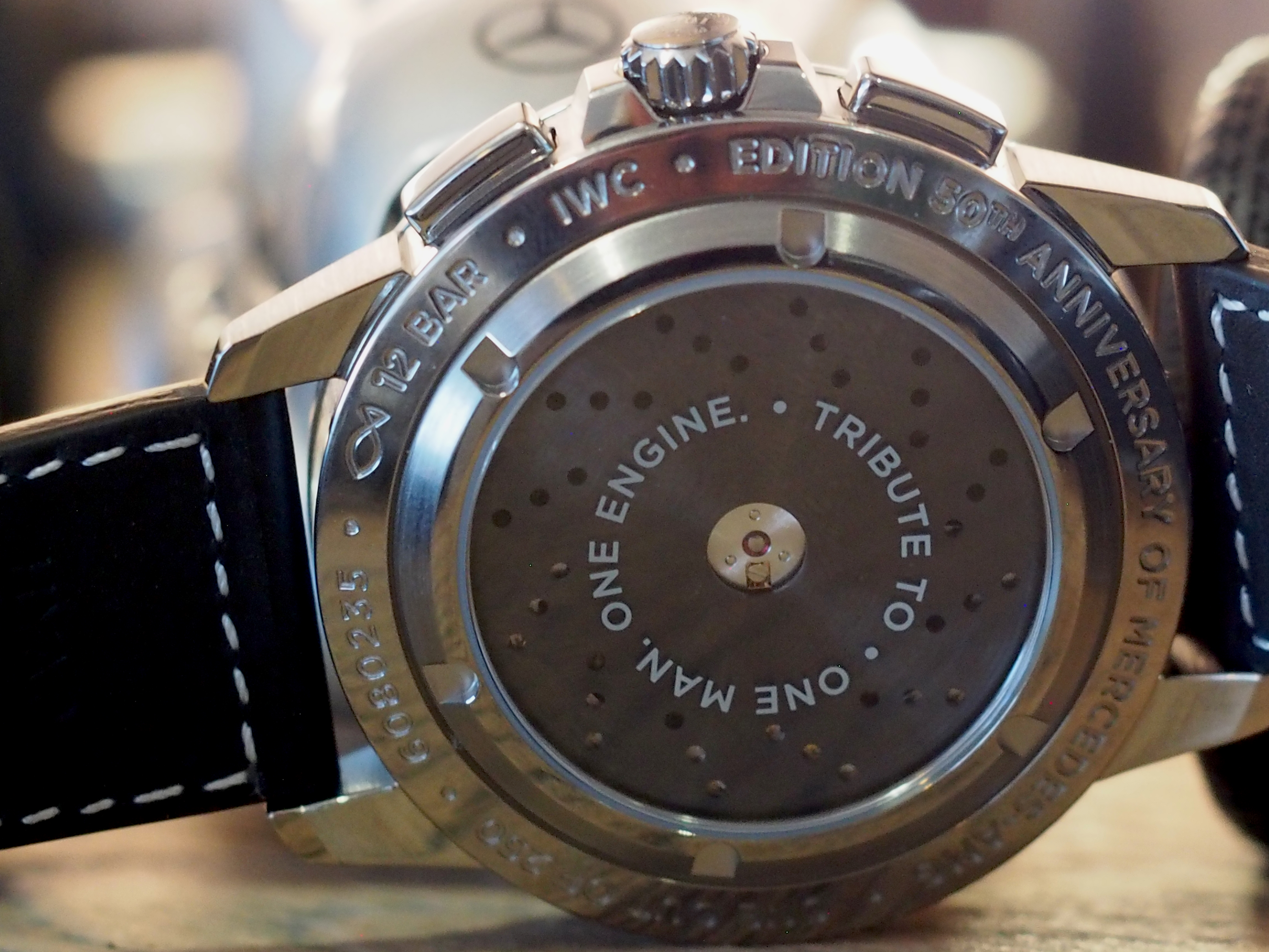 The transparent sapphire caseback of the IWC Ingenieur Chronograph Sport Edition “50th Anniversary of Mercedes-AMG” depicts the disk brake motif on the soft inner iron case that renders the watch anti-magnetic (Photo: R. Naas)