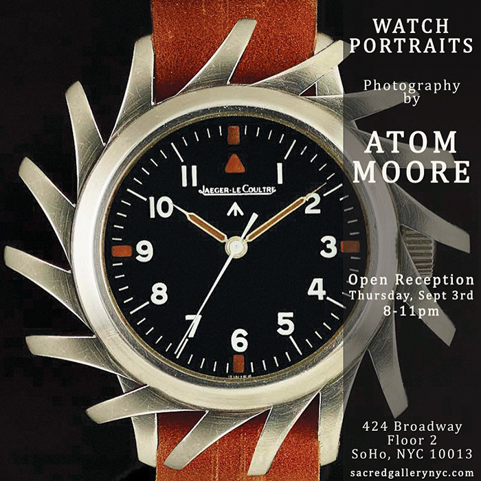 Acclaimed photographer and watch enthusiast Atom Moore, who can be seen every Wednesday evening hunched over a Leica and a light box shooting watches at RedBar New York’s ‘honeycomb hideout,’ will display many of his finest timepiece photographs through the month of September at Sacred Gallery in New York.