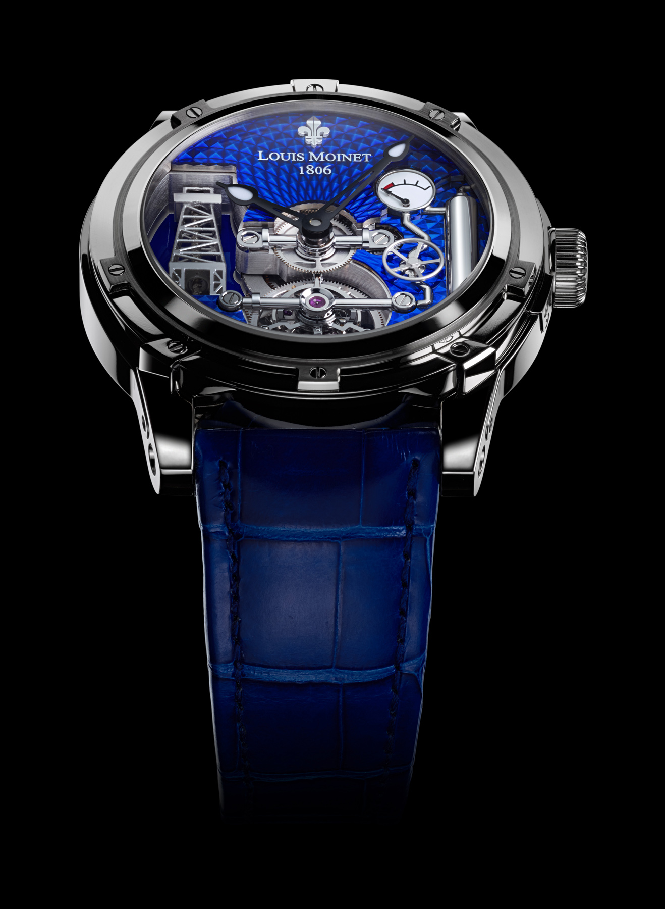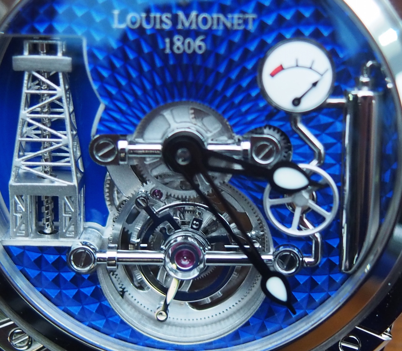 The tourbillon watch replicates the extraction of gas from the ground through a derrick, and all of the parts are animated. The derrick is crafted in sculptured gold and rises up on the left side of the watch, while the pipeline crosses the center the watch and eventually empires into a storage tank on the right side of the dial. A gas gauge or valve turns when the watch is wound and indicates the power reserve of the watch.
