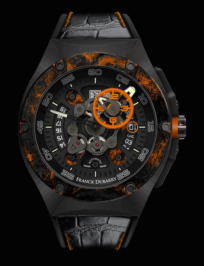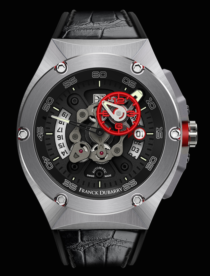 The reverse side of the watch features the brand’s emblem, the Homo Tempus, which is the sculpture of an active man with arms and legs outstretched. For Frank Dubarry the figure is emblematic of the person who manages his or her time with technology, who devours time in order to leave a mark on it, and who juggles both professional and personal lives accordingly.