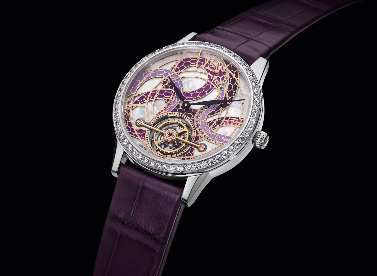 The artisanal dial is handcrafted using shimmering refined white mother of pearl as a base. Adorning the dial, fine gold bands outline the shape and scales of a serpent, expertly hand painted in varying shades of purple and handset with 51 individual blue, rose and purple gem stones, including two radiant rubies for the eyes. Dial accents continue to round out this work of art as leaf-shaped hands and floral inspired Arabic numbers radiate Bohemian nature and style. Bringing the royal color full circle, the Boheme ExoTourbillion comes fitted with a matching purple alligator strap and an 18-karat gold pin buckle set with a dazzling diamond.