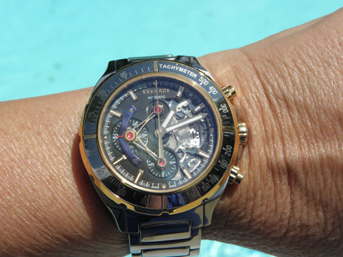 The performance of this watch — which I wore swimming and horseback riding – is top notch. The look of the two-tone version we are reviewing fit nicely from sporty weekend to business meetings and even out at night. While the power reserve is slightly shorter than I’d like – because I’d like power reserve to be at least 8 days — this is a watch I keep coming back to, for sport, for dress, for everyday. The best part of the mechanical and technically advanced Versace winner – the price: $5,495.