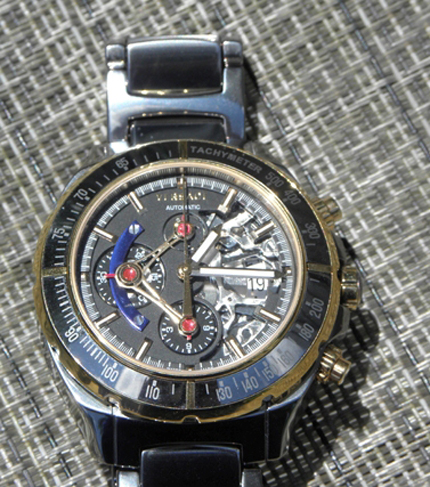 Being a fan of mechanical watches, I was thrilled to put the new special edition DV One Skeleton Chronograph on my wrist. The 43.5mm case is crafted in ceramic titanium – a high-tech compound that is light weight but extremely strong – giving it a bold look and feel. The black dial, with right side open to reveal the meticulous detailing, machining and perlage finish of the automatic movement, is immediately arresting.