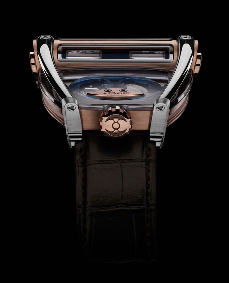 The engine of the watch is just as three-dimensional as the stunning case. Conceived and developed by MB&F from a Girard Perregaux base calibre, the automatic watch features a battle-axe winding rotor in 22k gold . Beating at 4 Hz (28,800 vph), the watch has a power reserve of 42 hours. The movement consists of 247 components and 30 jewels. It offers bi-directional jumping hours and trailing minutes — each displayed on one of two optical prisms. The watch is offered in 18-karat white gold and titanium, and in 18-karat rose gold and titanium. The front, back, top and bottom are crafted of anti-reflective sapphire crystal. It is water resistant to 30 meters so that it will withstand the river to a certain depth when you are so busy staring at the mesmerizing watch that you drive right off the road. The watch retails for about $84,000.