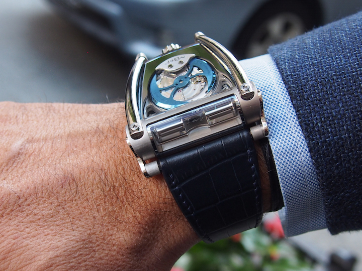 The watch features a roll-bar like protective support of the sapphire, titanium and gold case. (Photo: R. Naas)