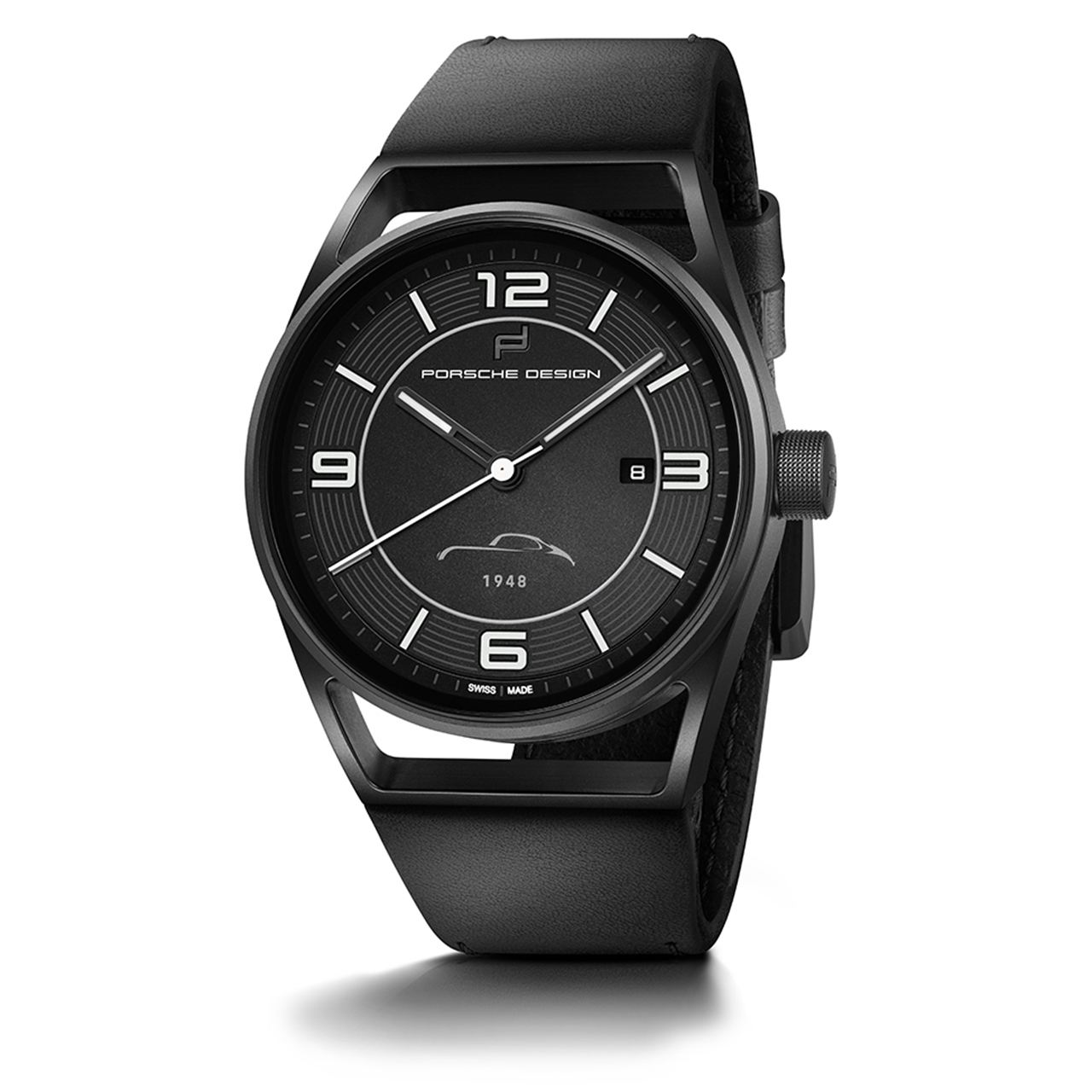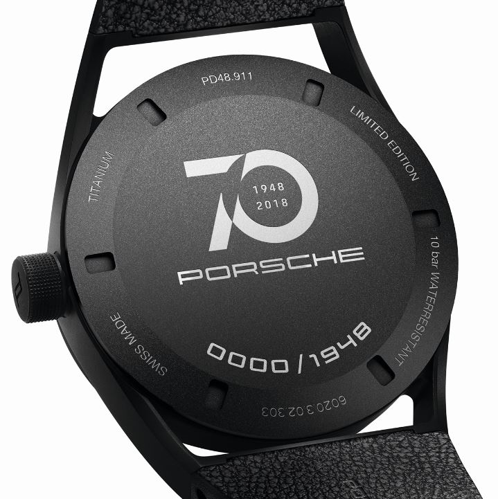 The 1919 Datetimer 70Y Sports Car Limited Edition watch is a 42mm titanium case with a carbide coating for added sheen. It houses an automatic Swiss movement with 38 hours of power reserve, and is equipped with the brand’s well-known Porsche Design Icon Rotor. The characteristically black dial features a silhouette of the Porsche 356 in the center, and the year 1948. The tachometer rings used in the dashboard of the Porsche 356 also grace the watch. To maximize readability against the black dial, the hands are white and the numbers and indexes are three-dimensional ceramic. There is also a date window at 3:00, and the watch (water resistant to 10 Bar) is finished with a leather strap made of the Porsche sports car leather. The caseback is finished with a special “70 years” logo engraving.