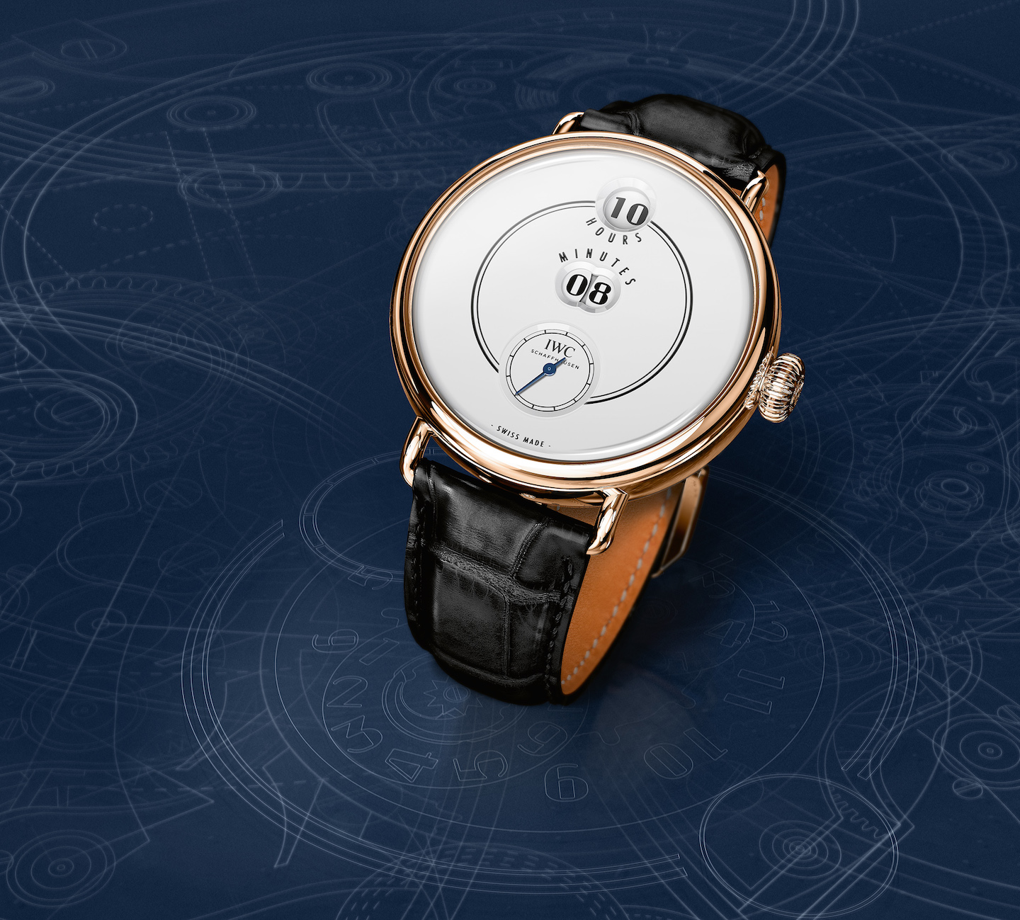 Crafted in 18-karat 5N rose gold, the technically advanced watch is the brand’s first ever wristwatch to house and original digital hours and minutes display – in the same configuration as it was built on the famed Pallweber pocket watches of 1884 that IWC created. The jumping numerals on the beautiful white lacquered dial are harmoniously designed with the small hours aperture at 12:00, the minutes aperture (via two windows) beneath it at the center of the watch, and the circular sub-seconds dial with outer track resides at the bottom at 6 o’clock. It is a clean, crisp digital indication of time via rotating disks.