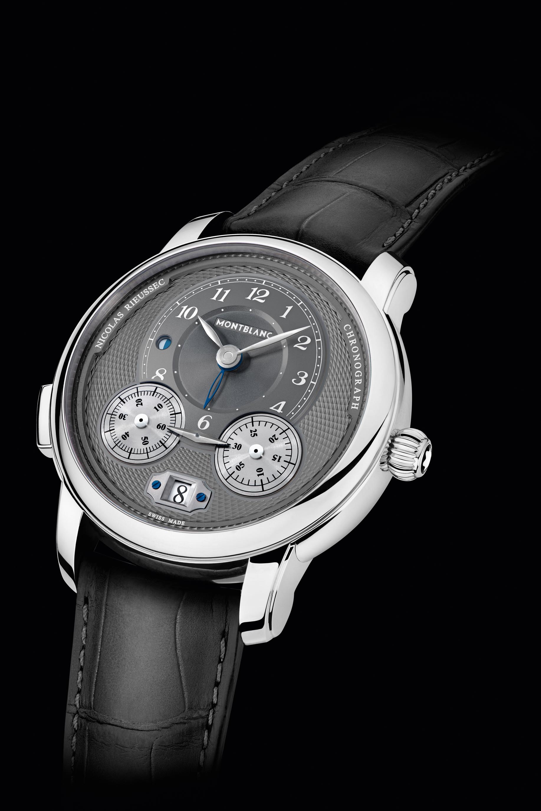 Additionally, Montblanc unveils two new Nicolas Rieussec Star Legacy Chronographs. Named for the watchmaker who created a pen-and-ink type of chronograph (time writer) stopwatch in the 1821, the newest Star Legacy Nicolas Rieussec Chronographs measure 44 mm in diameter and house the Montblanc Manufacture Caliber MB R200. One version is created in stainless steel with a gray anthracite-colored dial and silver accents. It retails for an incredible $3,625 – and for the dial aesthetics and technical aspects of this watch, that price is truly a veritable steal.