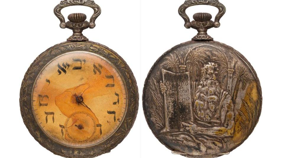 The silver-plated brass Swiss-made pocket watch features an engraving of Moses and the Ten Commandments on one side. The dial side has Hebrew numerals. The watch houses a rusted manual wind movement, and the dial is stained. While the watch naturally doesn’t work, it is an important piece of history. It joins a few other timepieces owned by other Titanic victims already on display at Miottle’s museum.